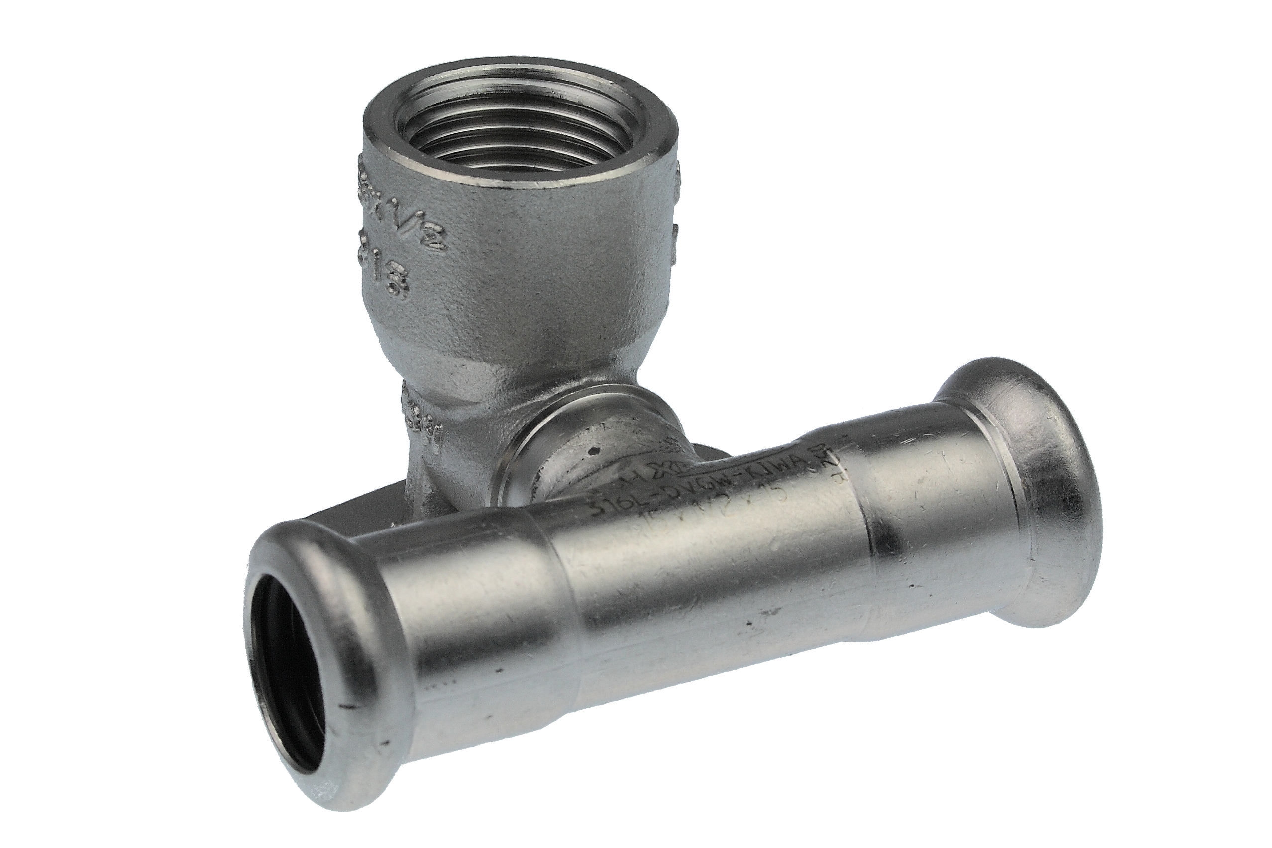 VSH XPress R2719 Ventilfäste 90° 15xRp15x15, dubbel muff x muff x invändig gänga i rostfritt stål 316. Följande användningsområden: