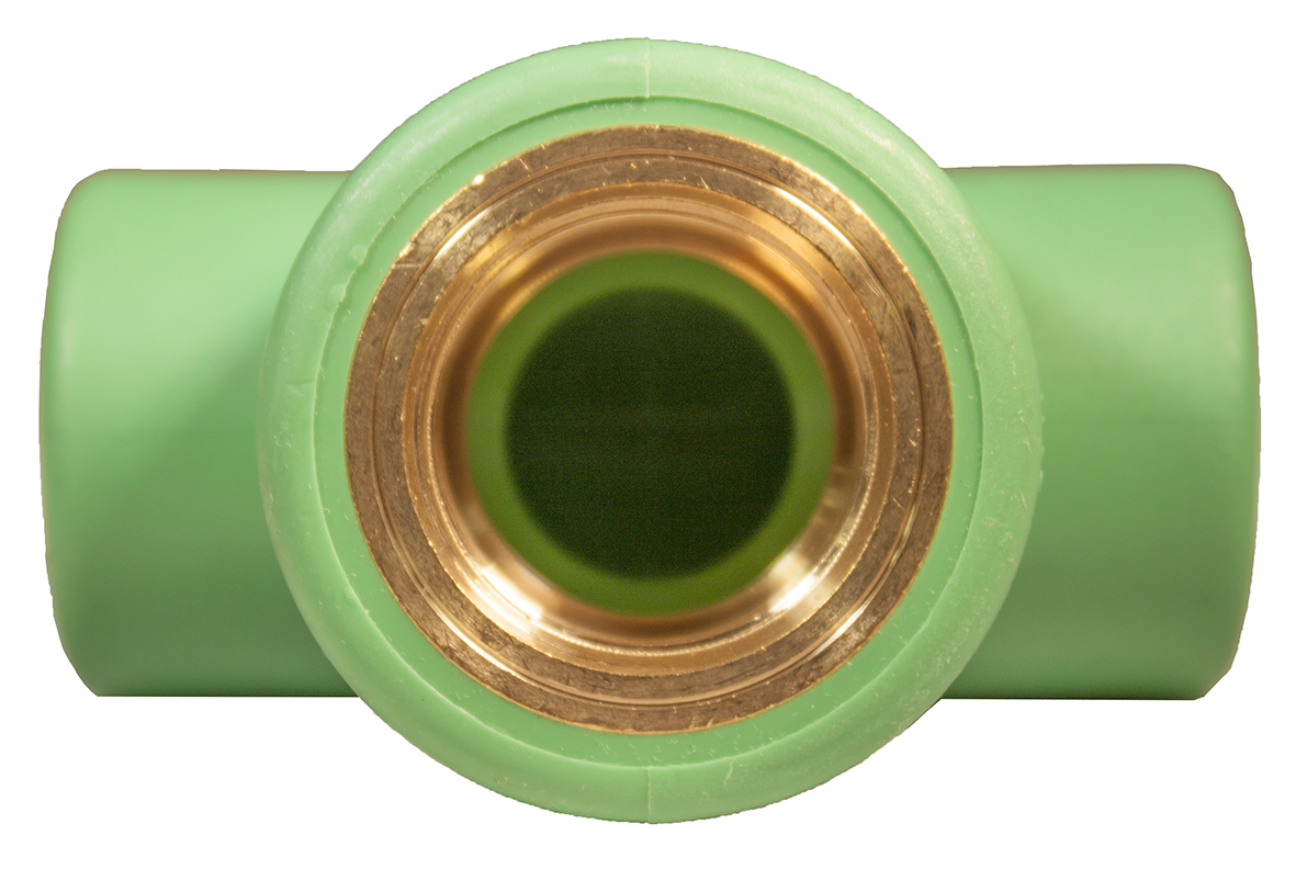 T-rör i PP med övergång till invänding gänga i avzinkningshärdig mässing. För Green pipe och Blue pipe systemen. SDR 7,4.