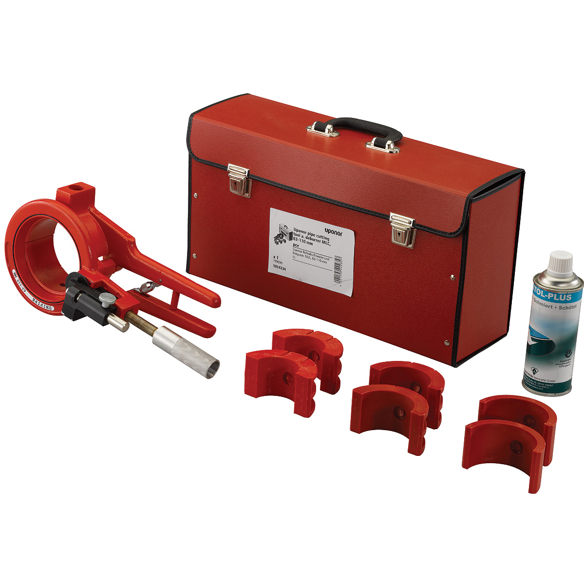Verktygsväska innehållande en kombinerad röravskärare/avfasningsverktyg för Uponor Kompositrör dimension 63-110 mm.