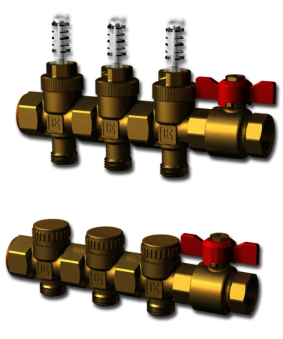Fördelaren har inbyggd avstängning för varje avstick på tilloppsstammen (nedre). På returstammen (övre) finns injusteringsmöjlighet samt synglas för flödesindikering.