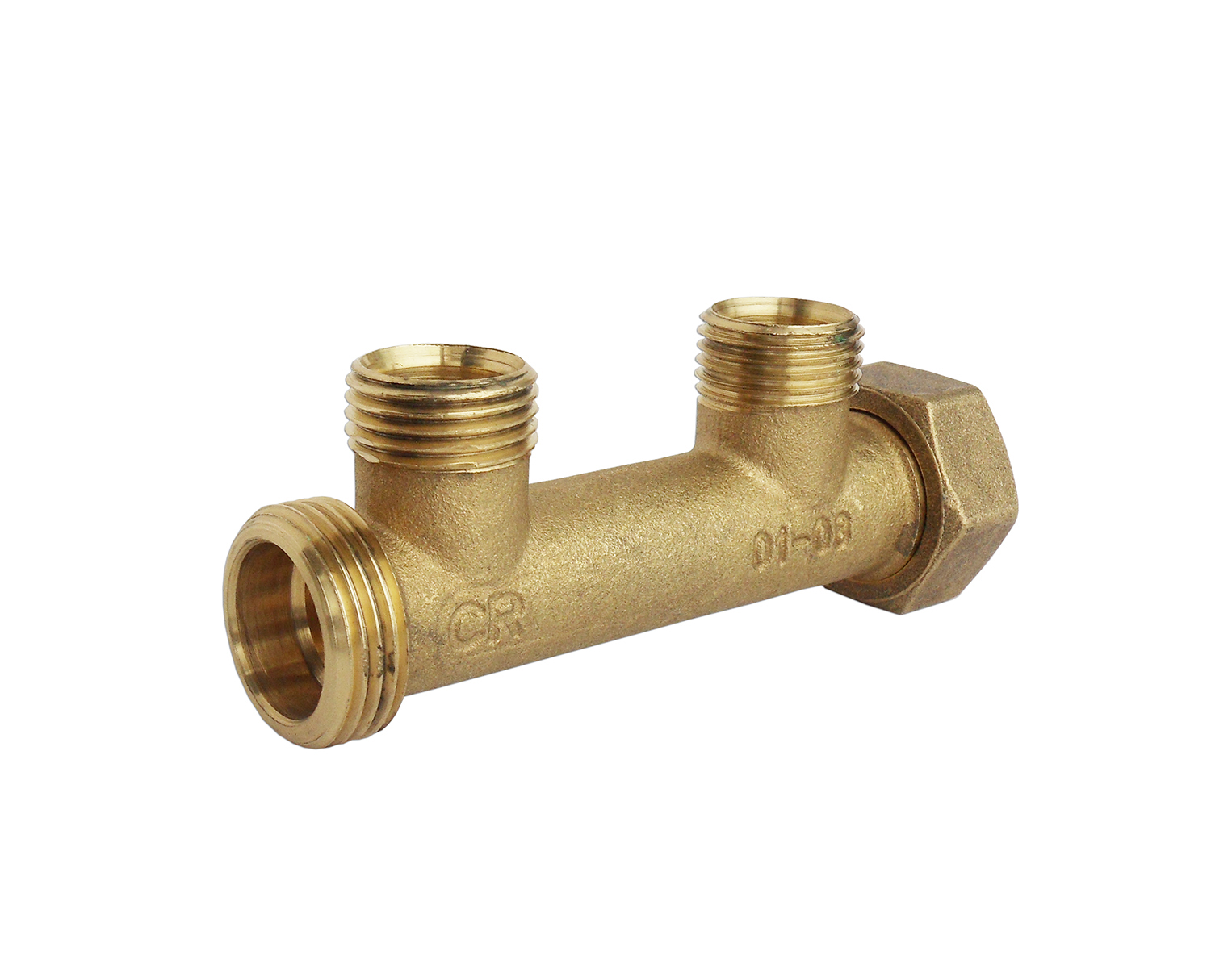 Alpex fördelare med två avstick. En utvändig och en invändig gänga med utvändig gänga på avsticken. PN10. Material avzinkningshärdig mässing.