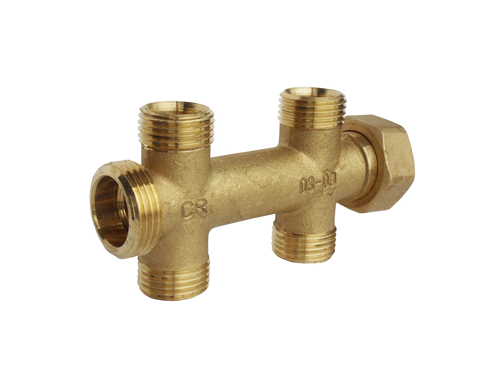 Alpex fördelare med två avstick upp och två avstick ner. En utvändig och en invändig gänga med utvändig gänga på avsticken. PN10. Material avzinkningshärdig mässing.