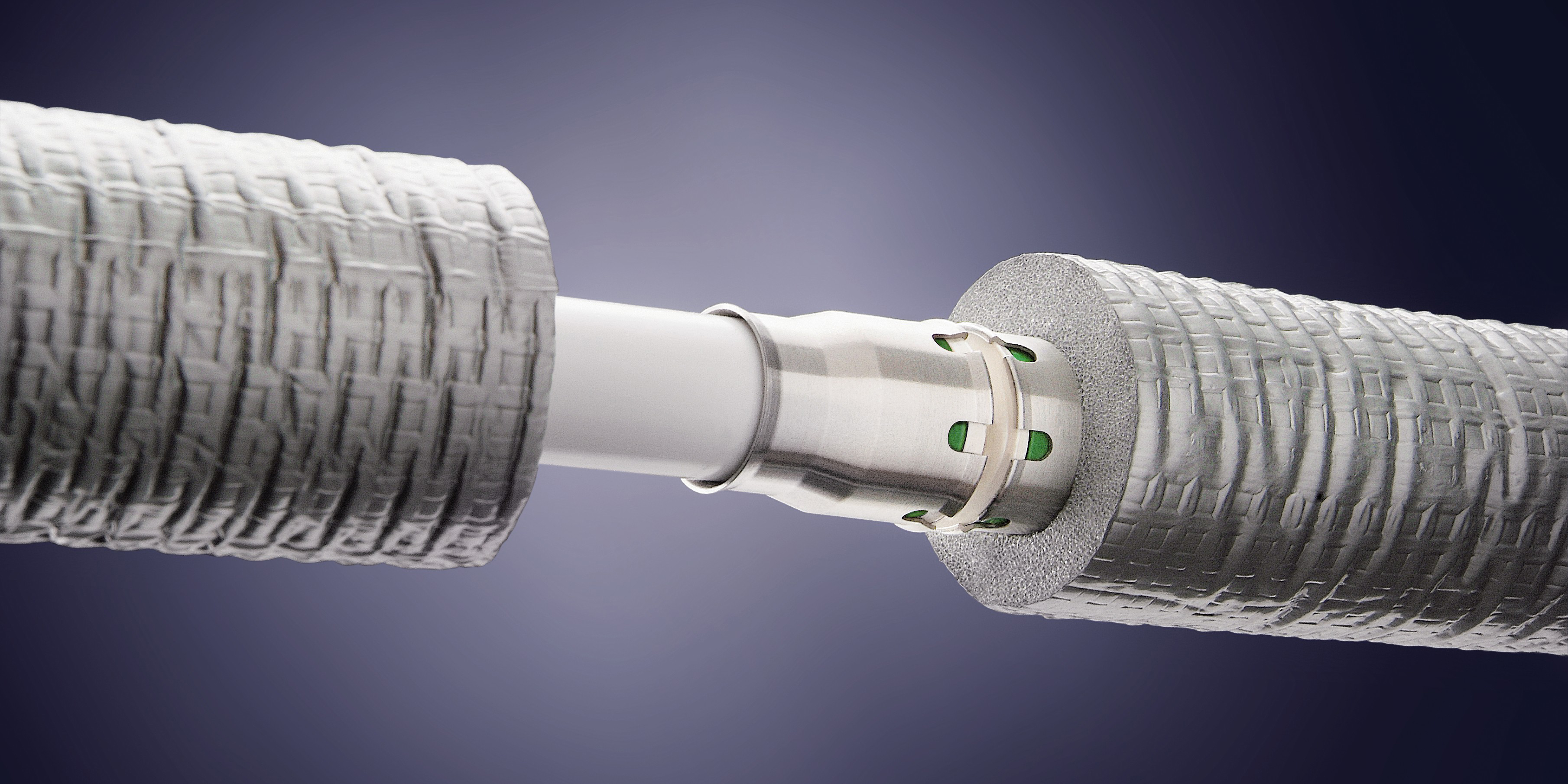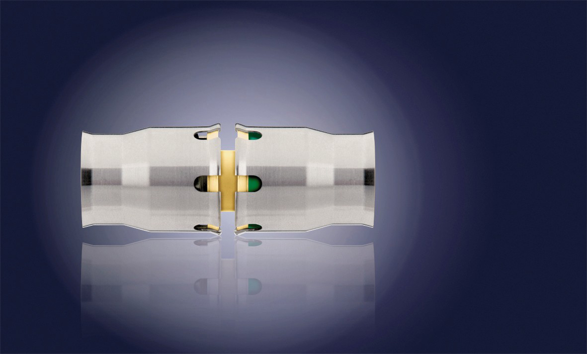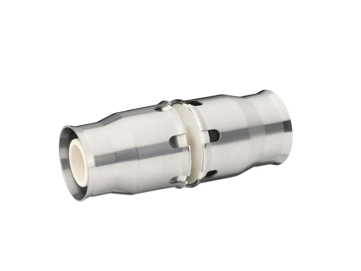 Fränkische Alpex-Plus rak koppling. Krävs ingen pressmaskin då rören endast sticks in och det blir tätt. Krävs särskilt verktyg för kalibrering av rörändar innan instick, samt om rören behöver tas ut igen. Material PPSU.