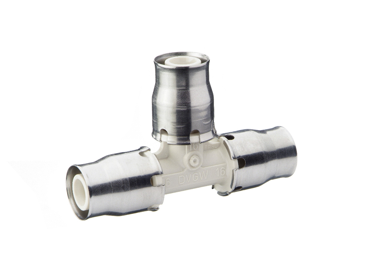 Fränkische Alpex-Plus T-rör. Krävs ingen pressmaskin då rören endast sticks in och det blir tätt. Krävs särskilt verktyg för kalibrering av rörändar innan instick, samt om rören behöver tas ut igen. Material PPSU.
