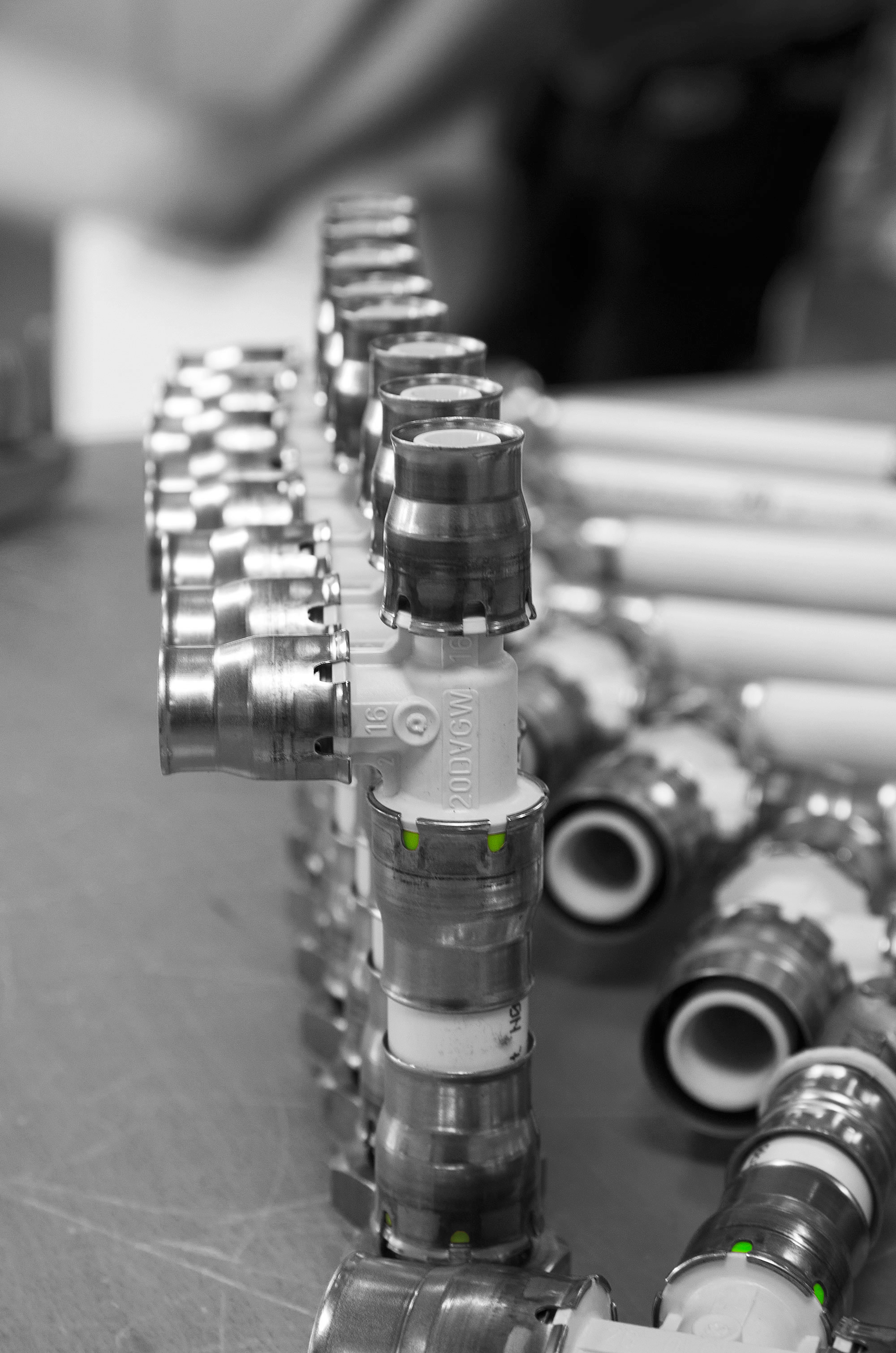 Fränkische Alpex-Plus T-rör med reducering. Krävs ingen pressmaskin då rören endast sticks in och det blir tätt. Krävs särskilt verktyg för kalibrering av rörändar innan instick, samt om rören behöver tas ut igen. Material PPSU.