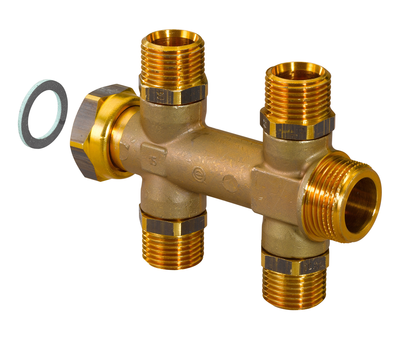Fördelare c/c 50 mm med G¾ anslutning med planpackning och löpande mutter, utan FPL-X kopplingsset. Avzinkningshärdig DR mässing. Fördelarröret har fyra stycken utbytbara G½ utvändigt gängade nipplar som kan ersättas med 3/8 Q&E-fördelaradaptrar.