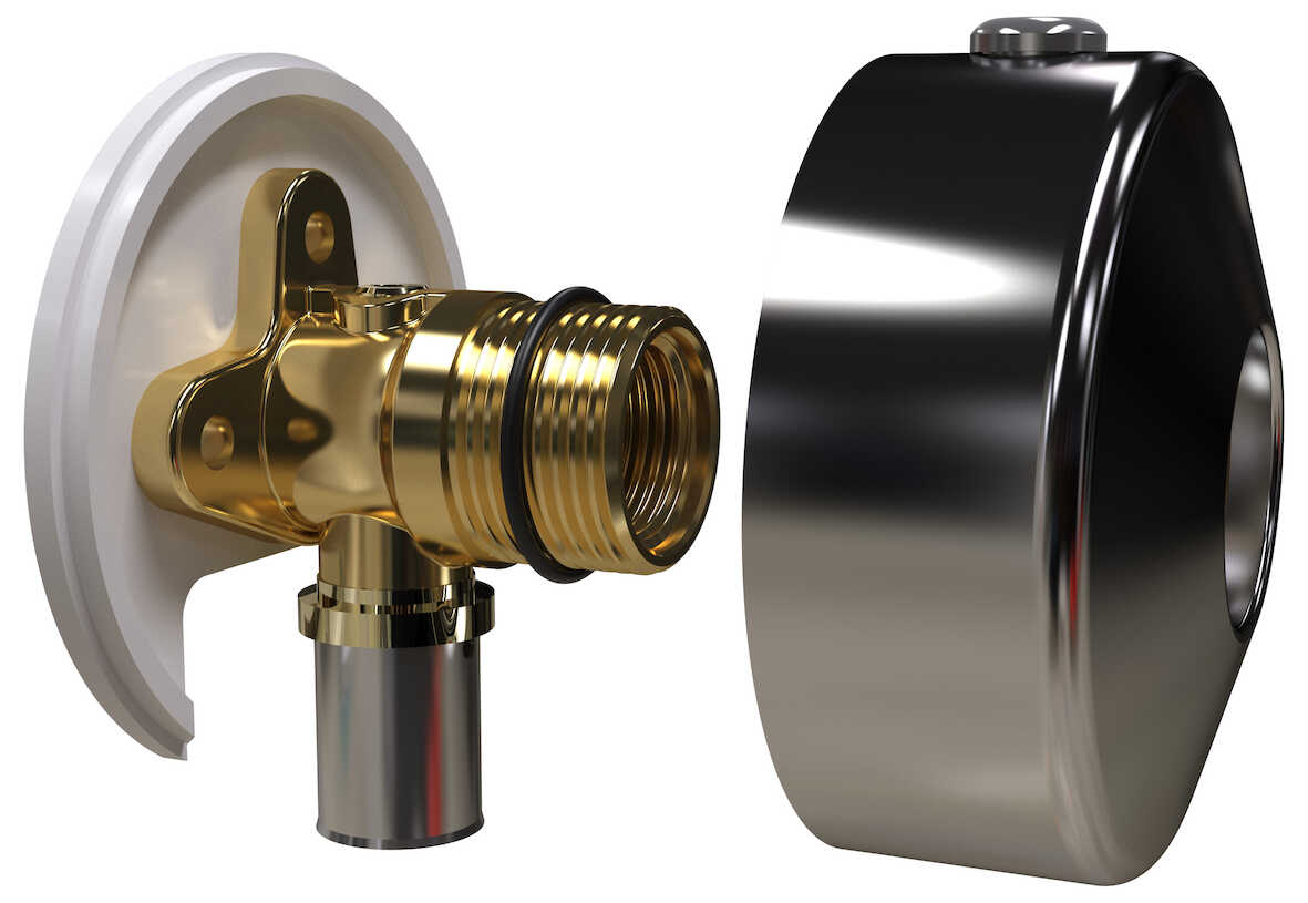 LK Ventilfäste med föravstängning och förkromad kåpa. Kan användas som anslutningskoppling med utv. gg G20 för montage av blandare enligt internationell standard eller ventilfäste med anslutning inv/utv G15/G20. Tre fästskruvar är bipackade.