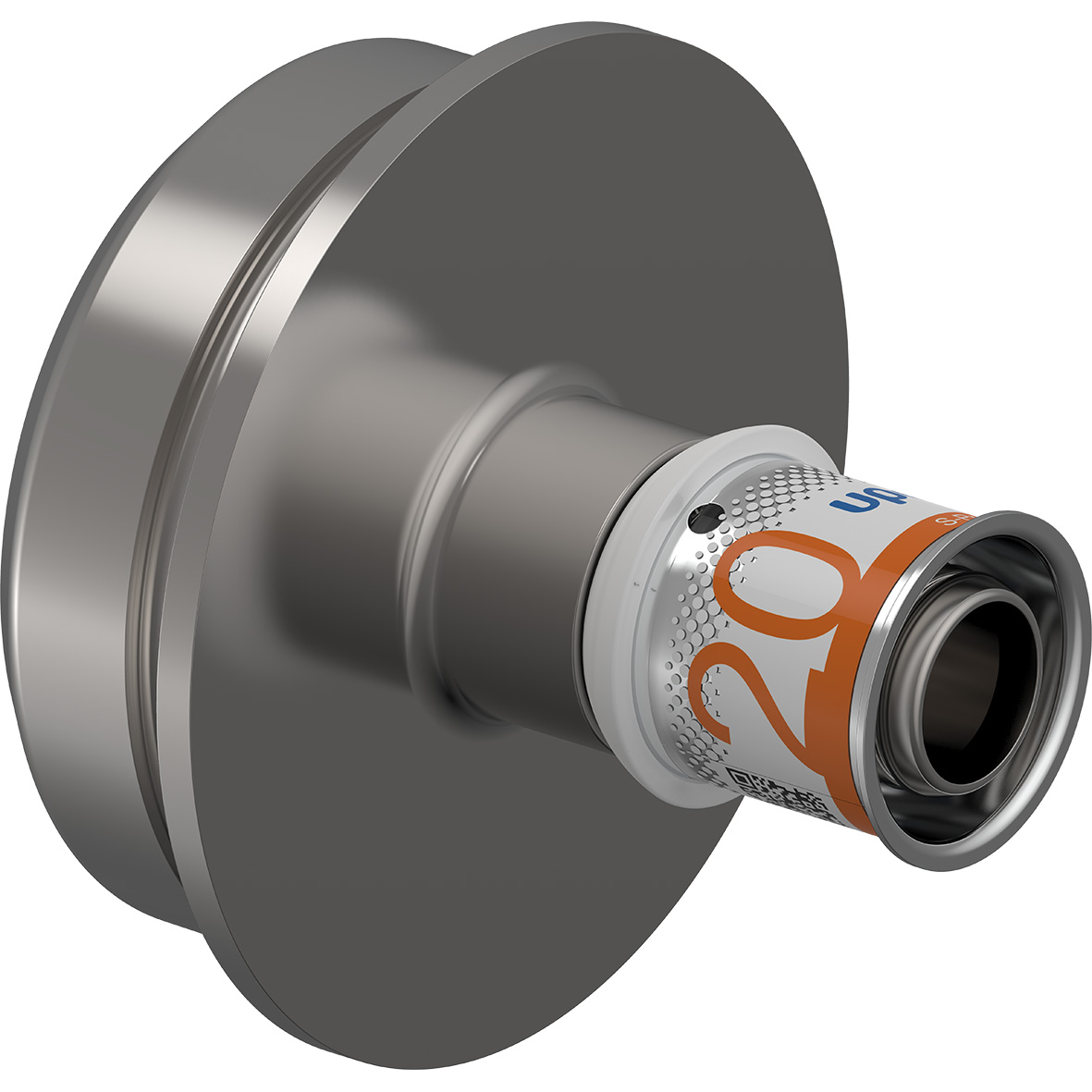 Uponor pressdel 20 mm för RS2. Tillverkad i förtennad AZH-mässing med presshylsa av rostfritt stål. Hylsan är fastsatt på kopplingen med en stoppring så att pressbacken är i rätt läge för pressning.