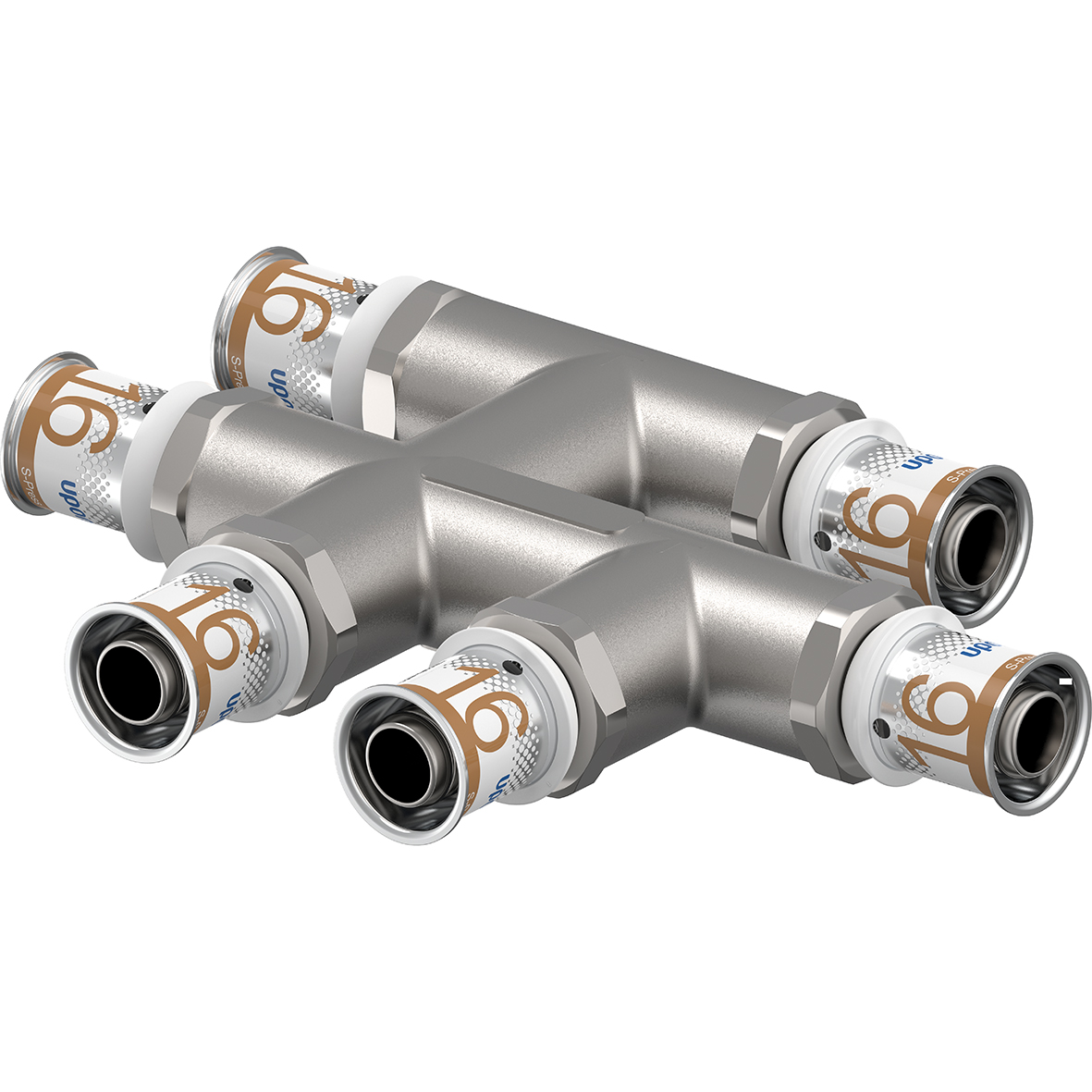 Radiatorfördelare i förtennad avzinkningshärdig mässing med presshylsa av rostfritt stål. Kopplingarna har pressanslag, press och färgdimensionsindikering. Kopplingen har inget krav på gradning av röret innan kopplingen förs på röret.