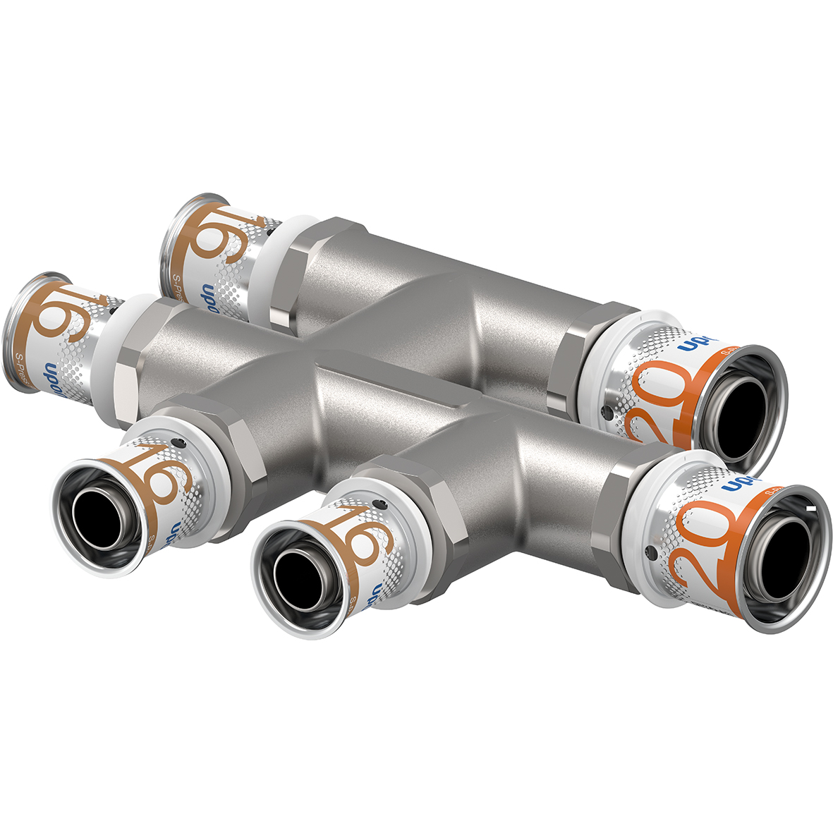 Radiatorfördelare i förtennad avzinkningshärdig mässing med presshylsa av rostfritt stål. Kopplingarna har pressanslag, press och färgdimensionsindikering. Kopplingen har inget krav på gradning av röret innan kopplingen förs på röret.