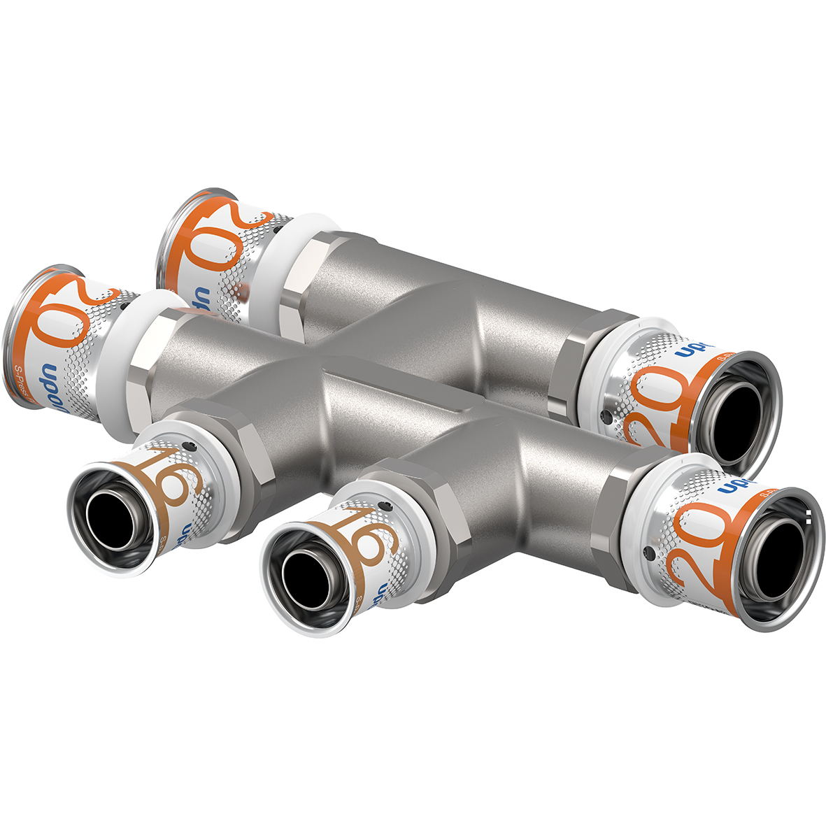 Radiatorfördelare i förtennad avzinkningshärdig mässing med presshylsa av rostfritt stål. Kopplingarna har pressanslag, press och färgdimensionsindikering. Kopplingen har inget krav på gradning av röret innan kopplingen förs på röret.