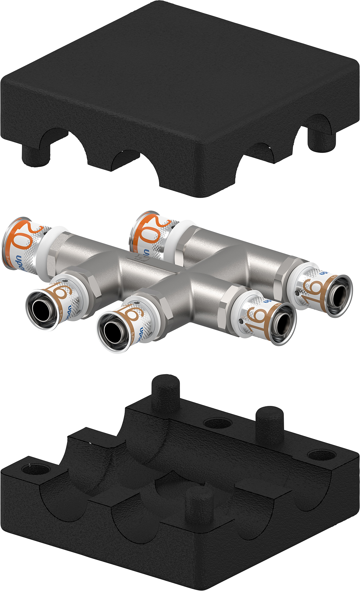 Radiatorfördelare i förtennad avzinkningshärdig mässing med presshylsa av rostfritt stål. Kopplingarna har pressanslag, press och färgdimensionsindikering. Kopplingen har inget krav på gradning av röret innan kopplingen förs på röret. Isolering medföljer.