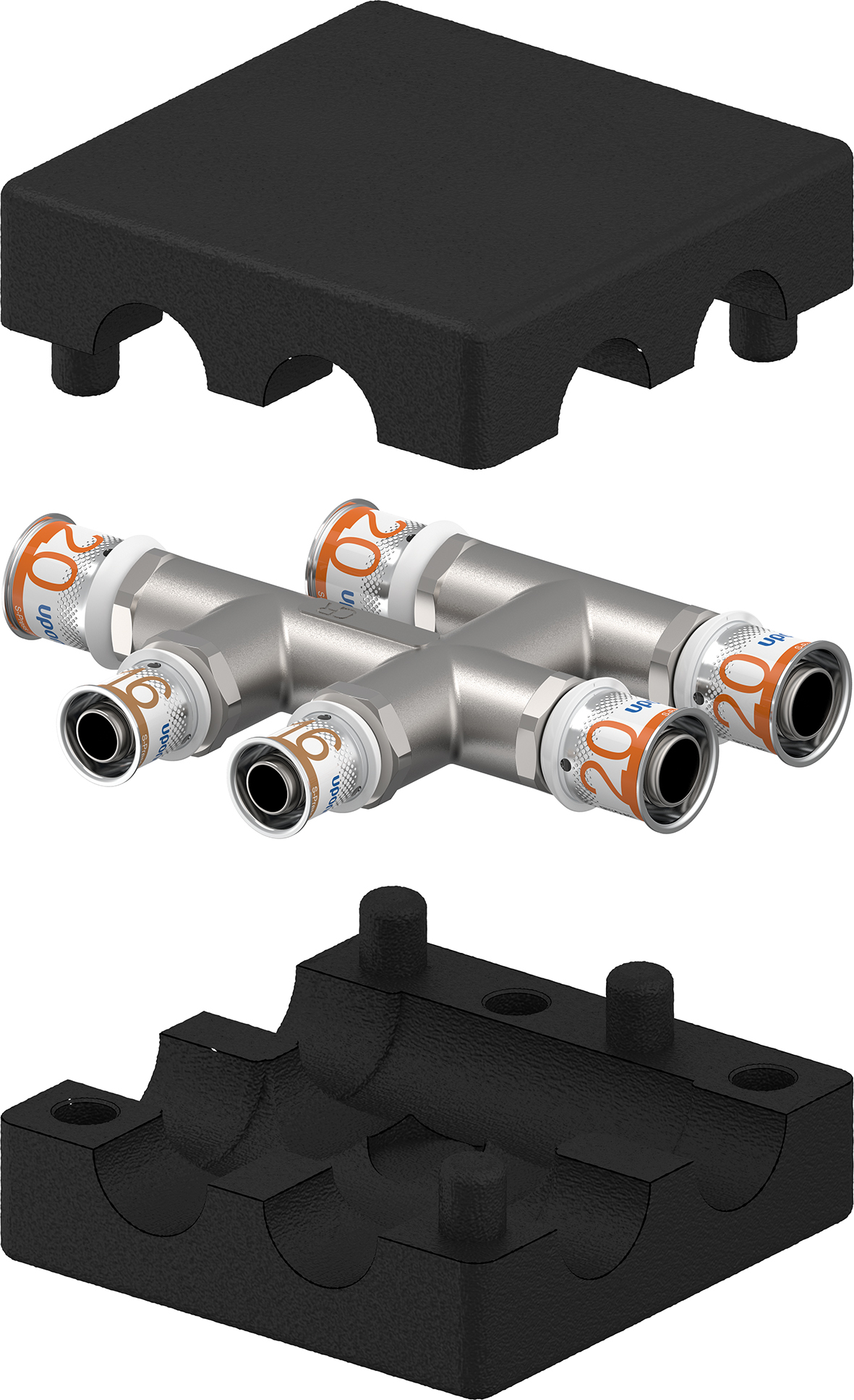 Radiatorfördelare i förtennad avzinkningshärdig mässing med presshylsa av rostfritt stål. Kopplingarna har pressanslag, press och färgdimensionsindikering. Kopplingen har inget krav på gradning av röret innan kopplingen förs på röret. Isolering medföljer.