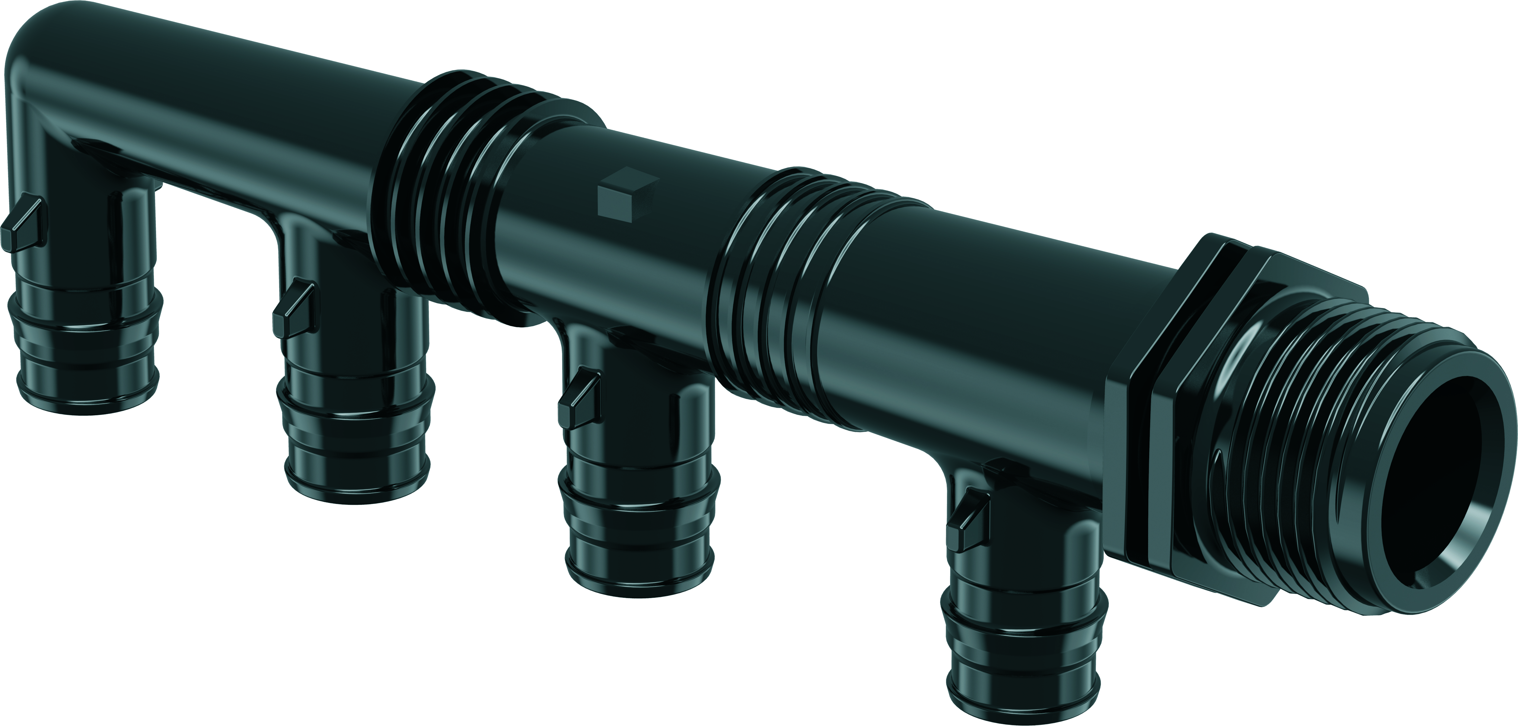 Uponor Q&E PPSU fördelare med utvändig gänga. Q&E-ringar beställs separat. Med Uponor Q&E PPSU och Uponor Combi Pipe uppnår man ett hygieniskt, korrosionsfritt rörsystem som inte avger några metaller till tappvattnet då ingen vattenberörd metall finns i systemet. Gängtätning skall ske med gängtätning som uppfyller standard EN 751-3. Fördelare med c/c 45+35 mm ska ej användas i skåp.