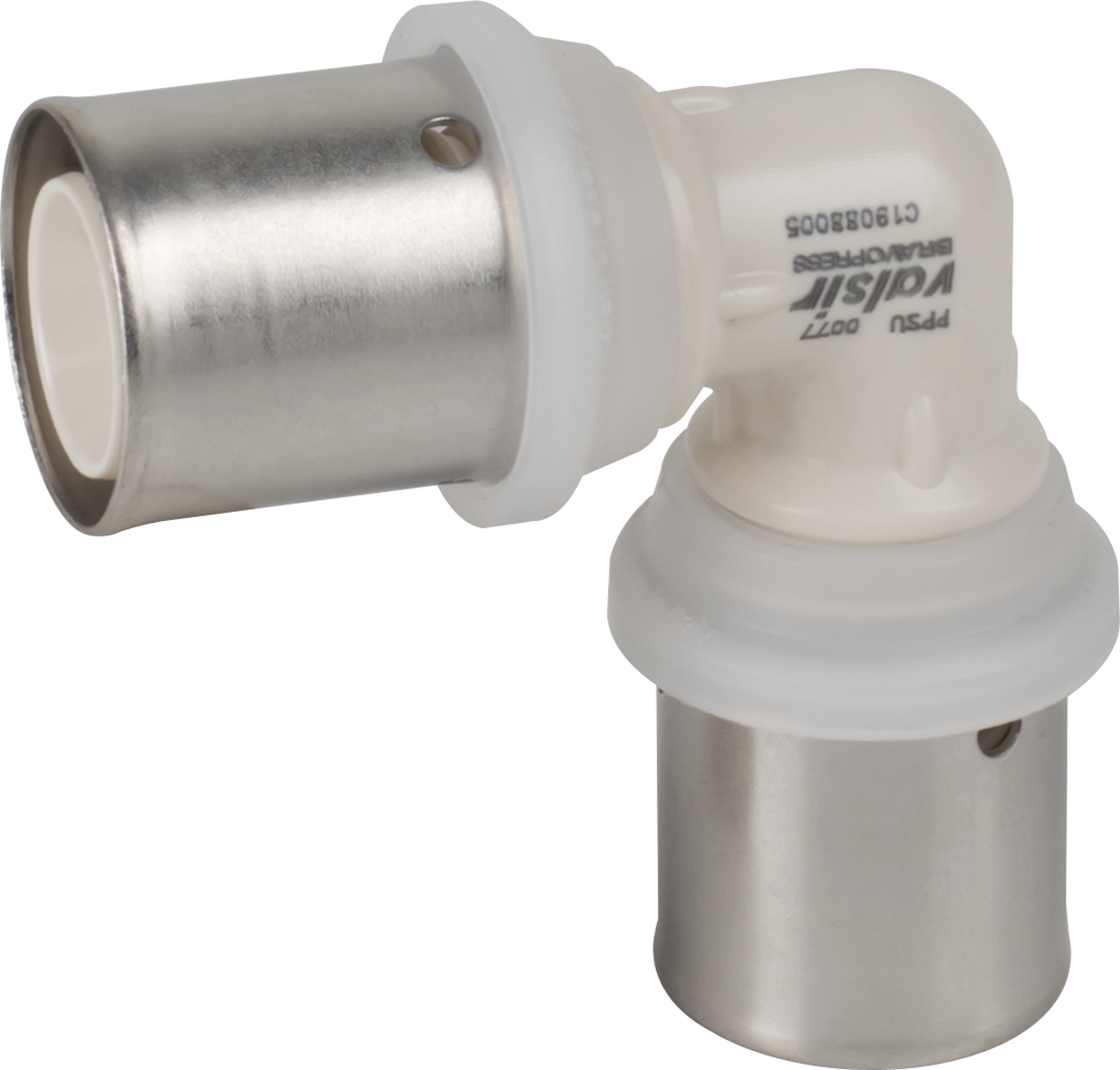 VALSIR Bravopress, koppling för sammanfogning av flerskiktsrör PEX/AL/PEX. Med LBP – Leak Before Press – teknologin indikeras vattenläckage av opressad koppling i samband med att systemet fylls på utan tryck (gäller kopplingar med diameter upp till 40 mm). Munstycket har O-ringar som säkerställer täthet i systemet och försäkrar att inga haverier inträffar. Kopplingarna är tillverkade enligt standard EN ISO 21003-1