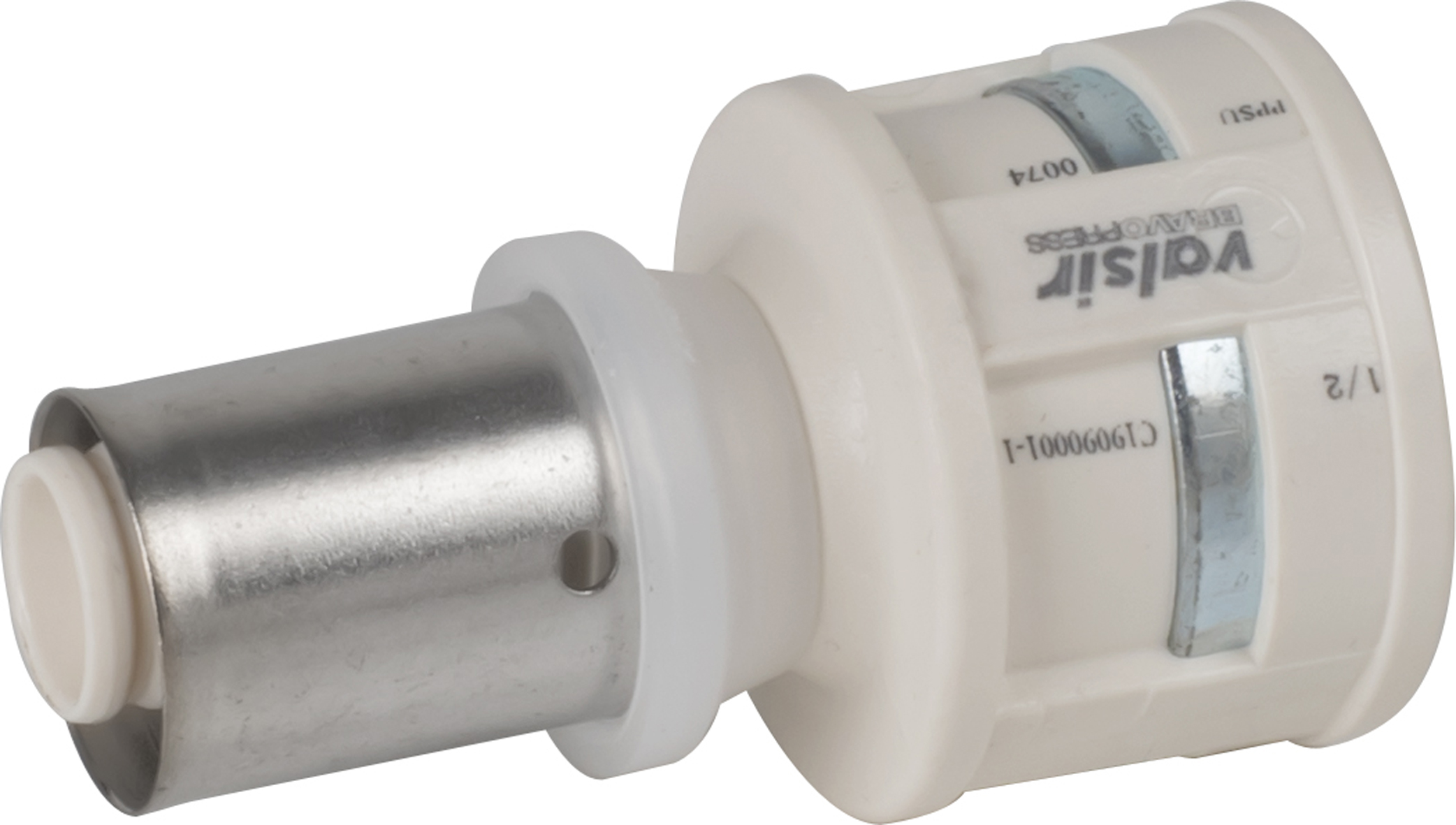 VALSIR Bravopress, koppling för sammanfogning av flerskiktsrör PEX/AL/PEX. Med LBP – Leak Before Press – teknologin indikeras vattenläckage av opressad koppling i samband med att systemet fylls på utan tryck (gäller kopplingar med diameter upp till 40 mm). Munstycket har O-ringar som säkerställer täthet i systemet och försäkrar att inga haverier inträffar. Kopplingarna är tillverkade enligt standard EN ISO 21003-1