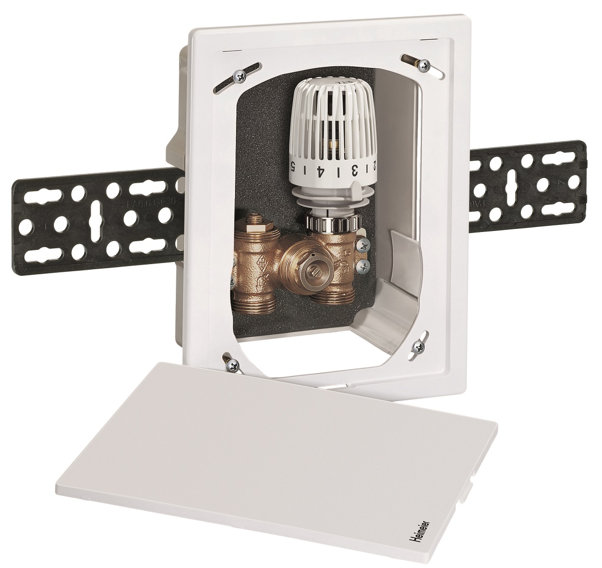 Infälld box med golvvärmereglering och justerbar vit täckplatta för individuell returtemperaturbegränsning, röranslutning G3/4