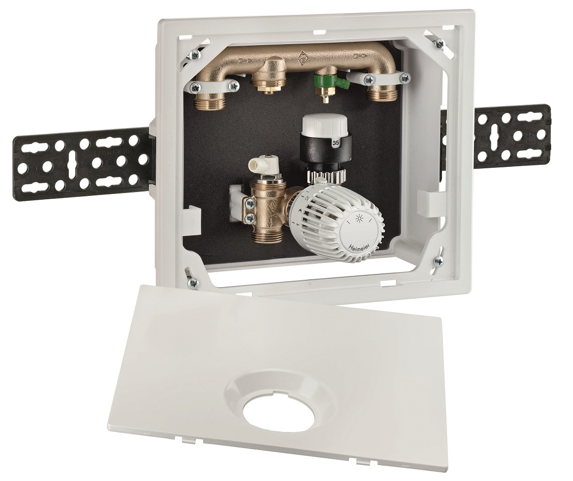 Infälld box med golvvärmereglering och extra tilloppsledning samt justerbar vit täckplatta för individuell rumstemperaturreglering och returtemperaturbegränsning utan elektrisk anslutning, röranslutning G3/4