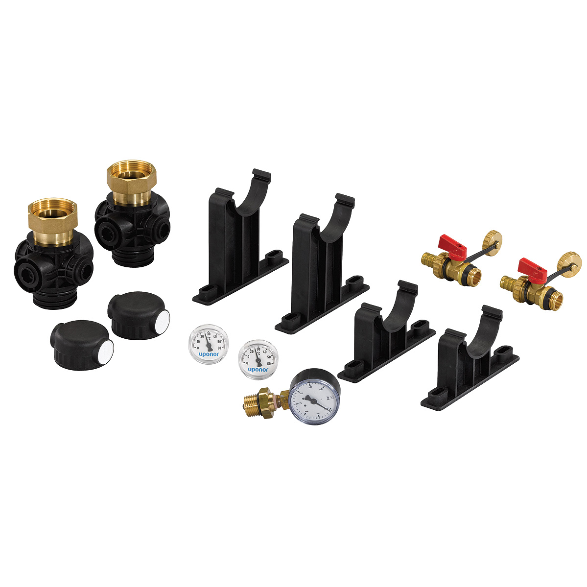 Grundsats för montering av Uponor Magna fördelarmoduler. Innehållande fästdon, ändstycken, anslutningar 1 1/2" påfyllnings/avluftningsventiler, manometer, 2 termometrar, 2 planpackningar.