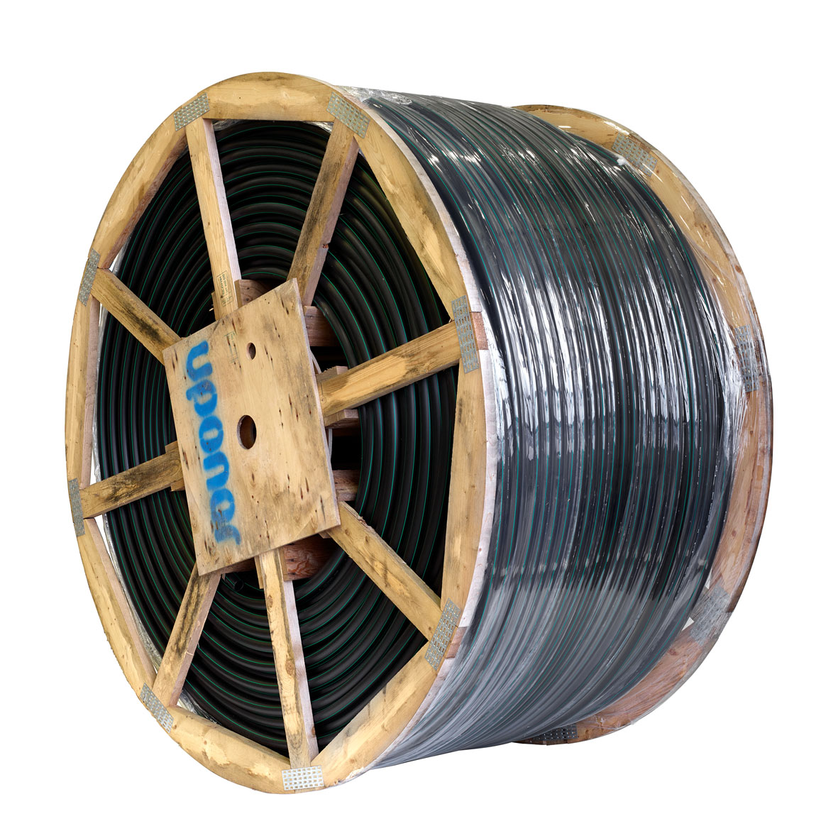 Uponor Optokabelskyddsrör 40/32,6 längd 2000m, lågfriktion med grönstripe av PEH på engångstrumma i trä