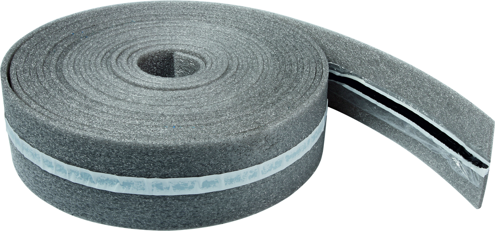 Mått: 40 m x 150 mm x 10 mm. Levereras 40 m / rulle. Av PE skum med tejpbeklädd undersida. Kantband för ljuddämpning och upptagning av termiska rörelser vid gjutning.