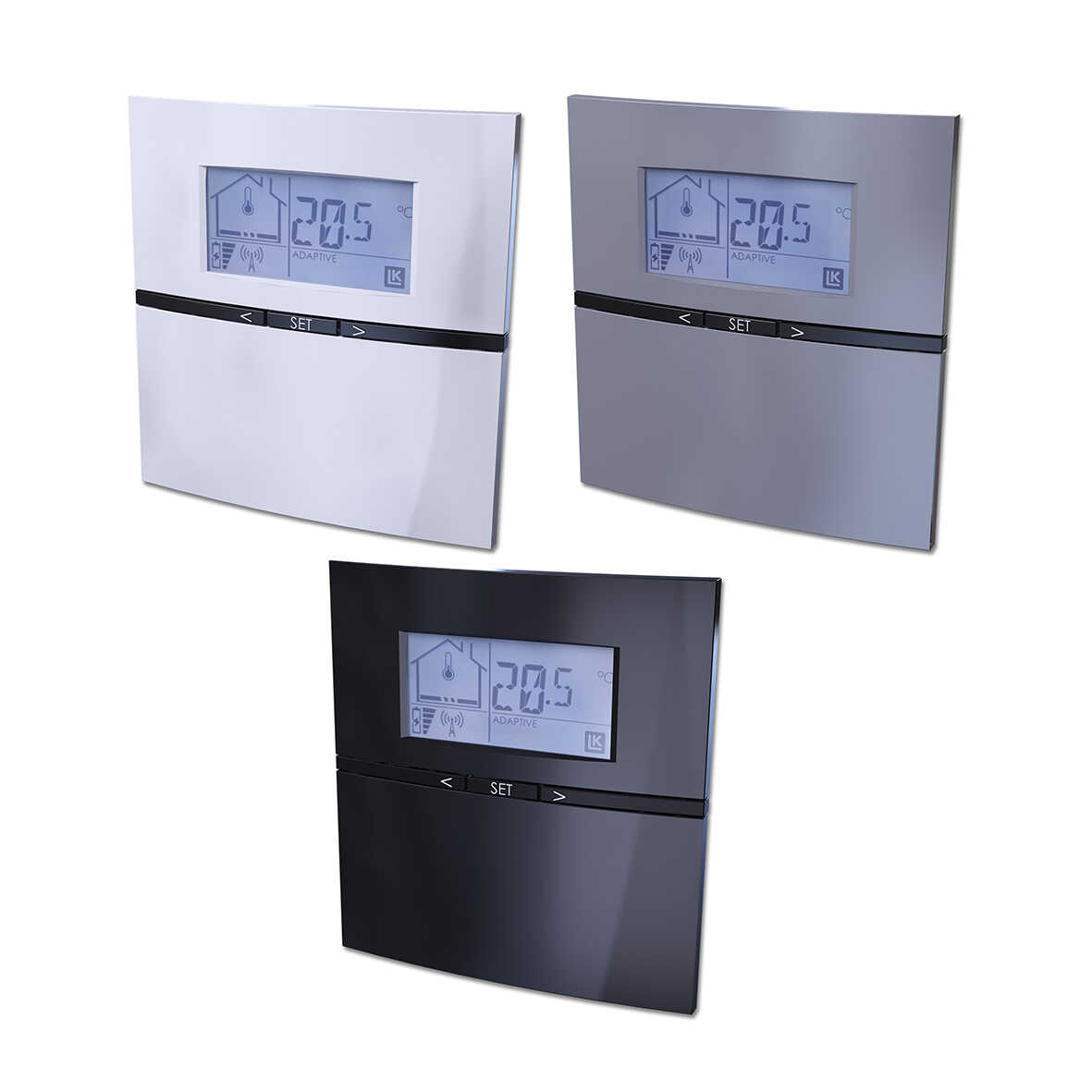 Rumstermostaten finns i färgerna högblank vit, silvergrå eller högblank svart.