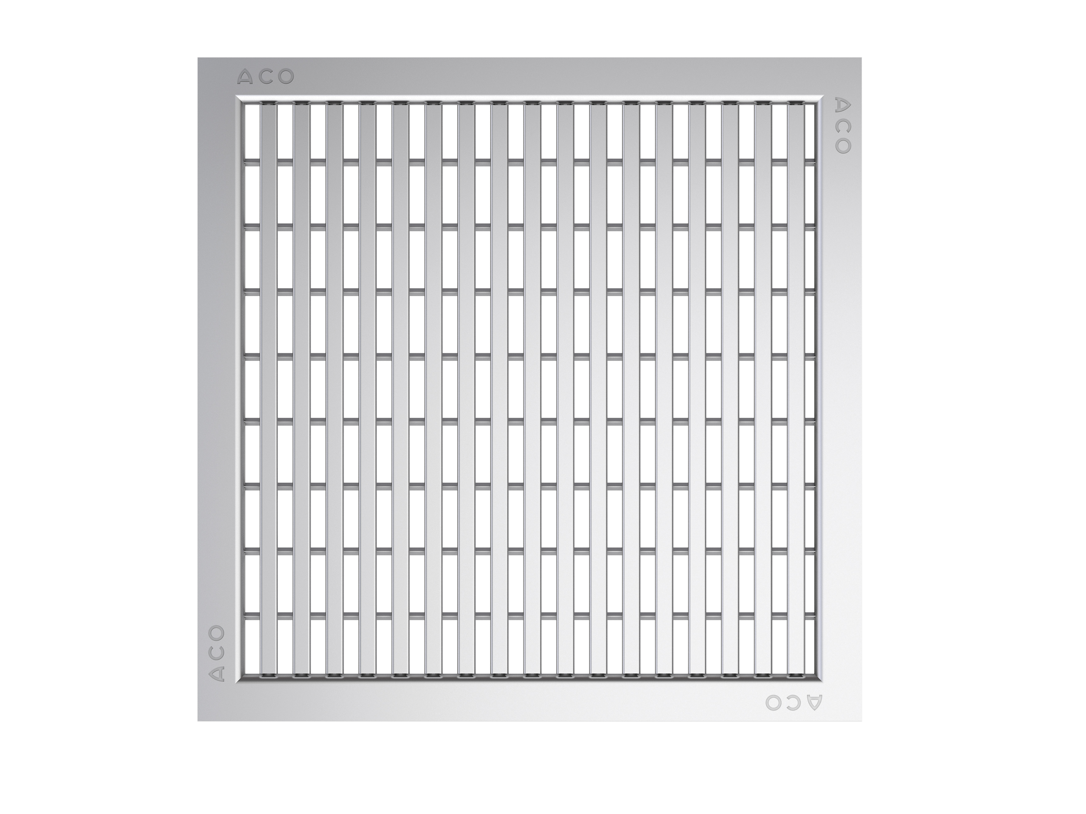 Längsgående spaltgaller i rostfritt stål. Mått (LxB): 250 x 250 mm. Passar ACO Self Europoint-serien.