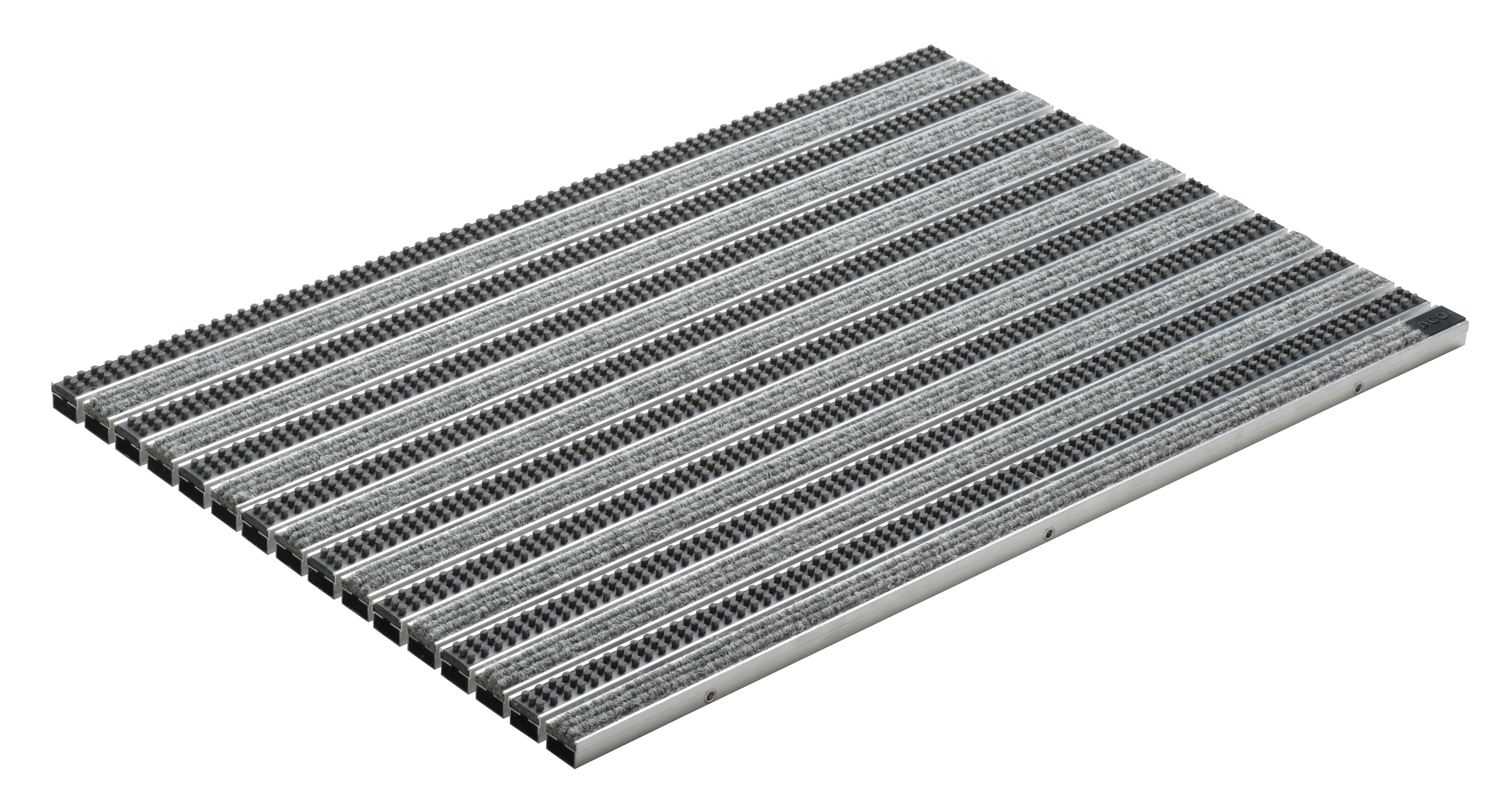 Galler i aluminium med nålfiltsmatta och tre gummiborstar. Färg: Grå. Mått (LxBxH): 1000 x 500 x 20 mm. Passar ACO Self Vario-serien. För montering utomhus under tak.