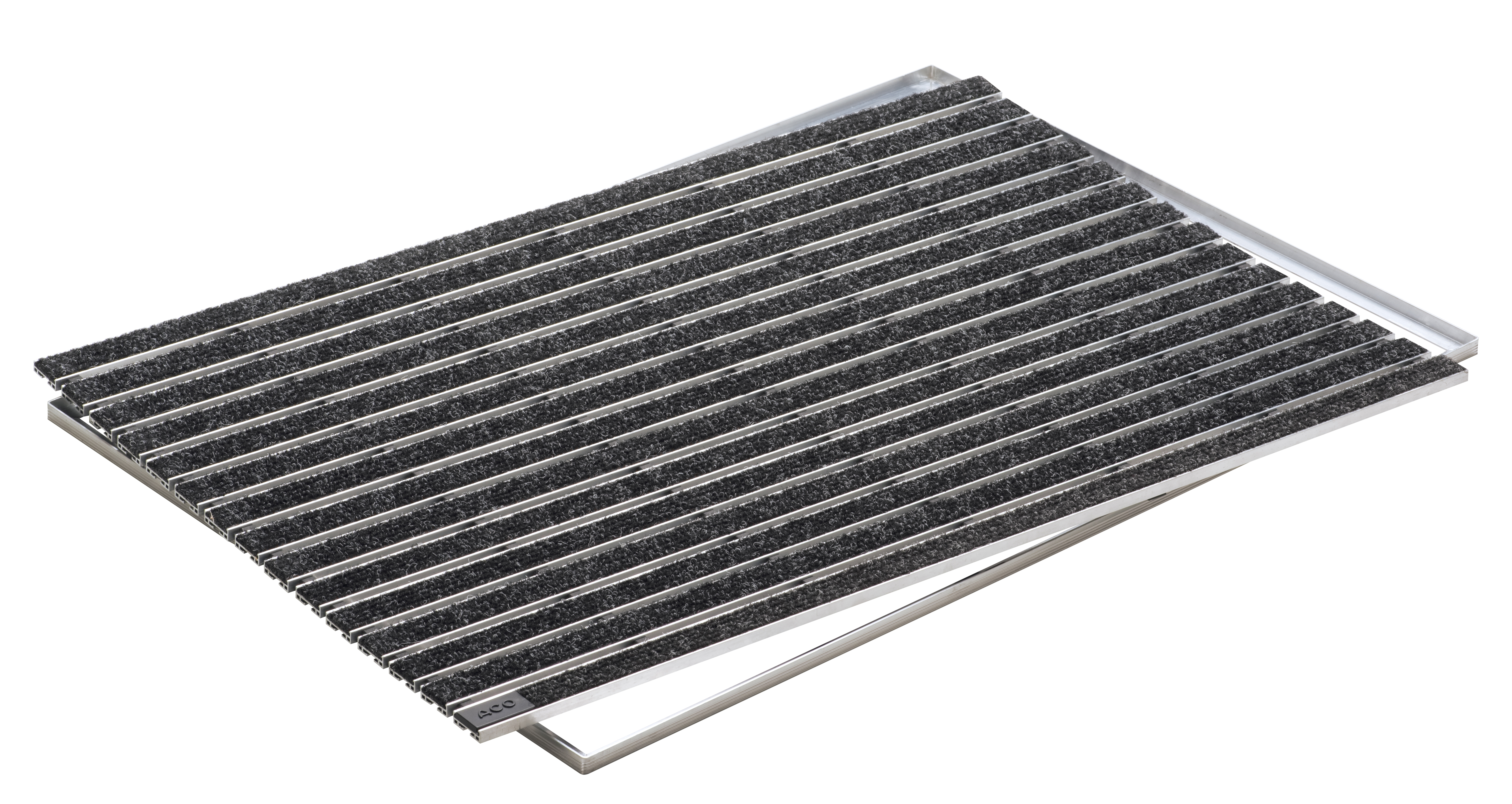 Galler i aluminium med nålfiltsmatta. Färg: Svart. Mått (LxBxH): 600 x 400 x 20 mm. Inkl. ram i aluminium. Passar ACO Self Vario-serien. För montering inomhus.
