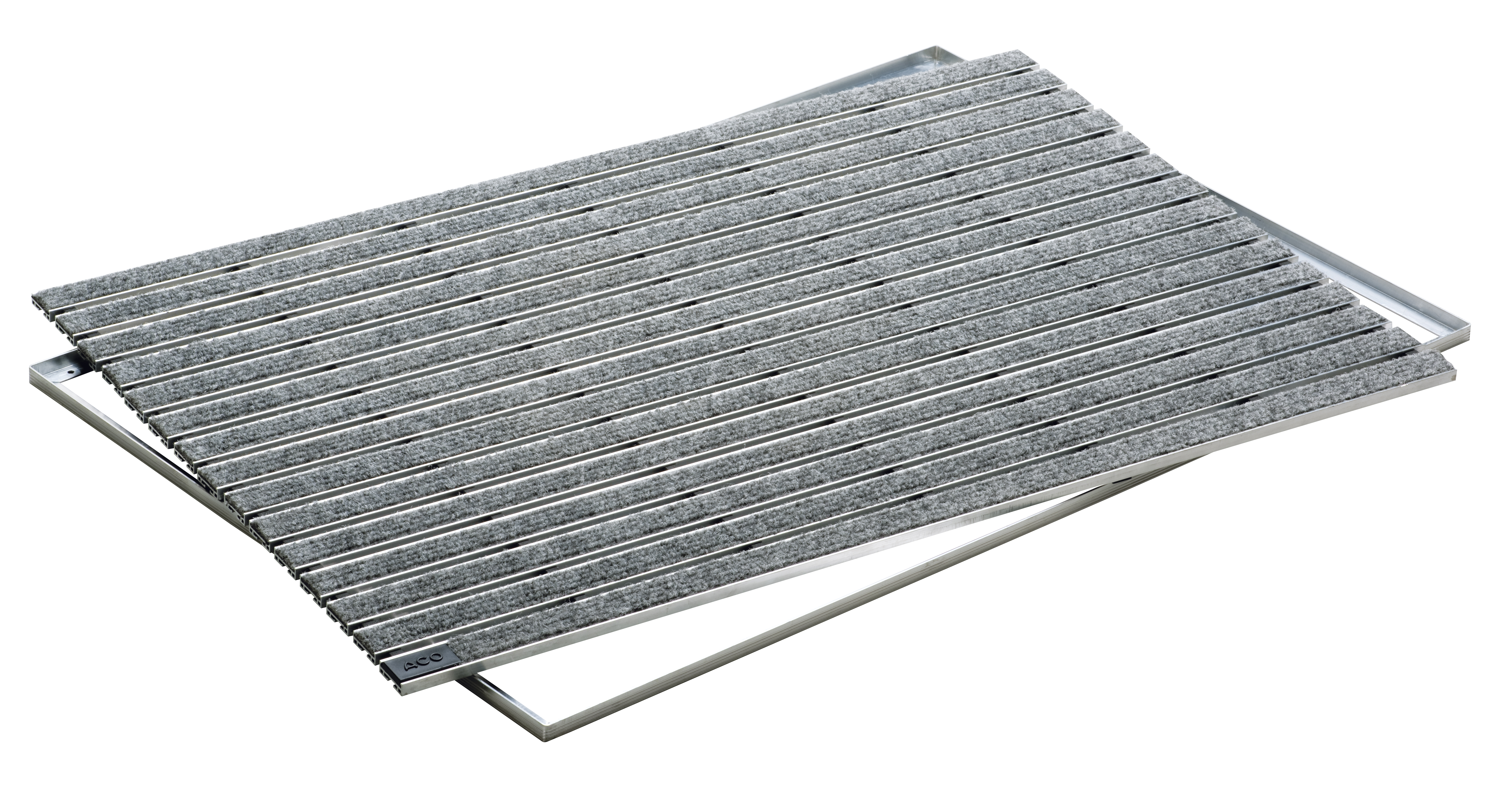 Galler i aluminium med nålfiltsmatta. Färg: Grå. Mått (LxBxH): 600 x 400 x 20 mm. Inkl. ram i aluminium. Passar ACO Self Vario-serien. För montering inomhus.