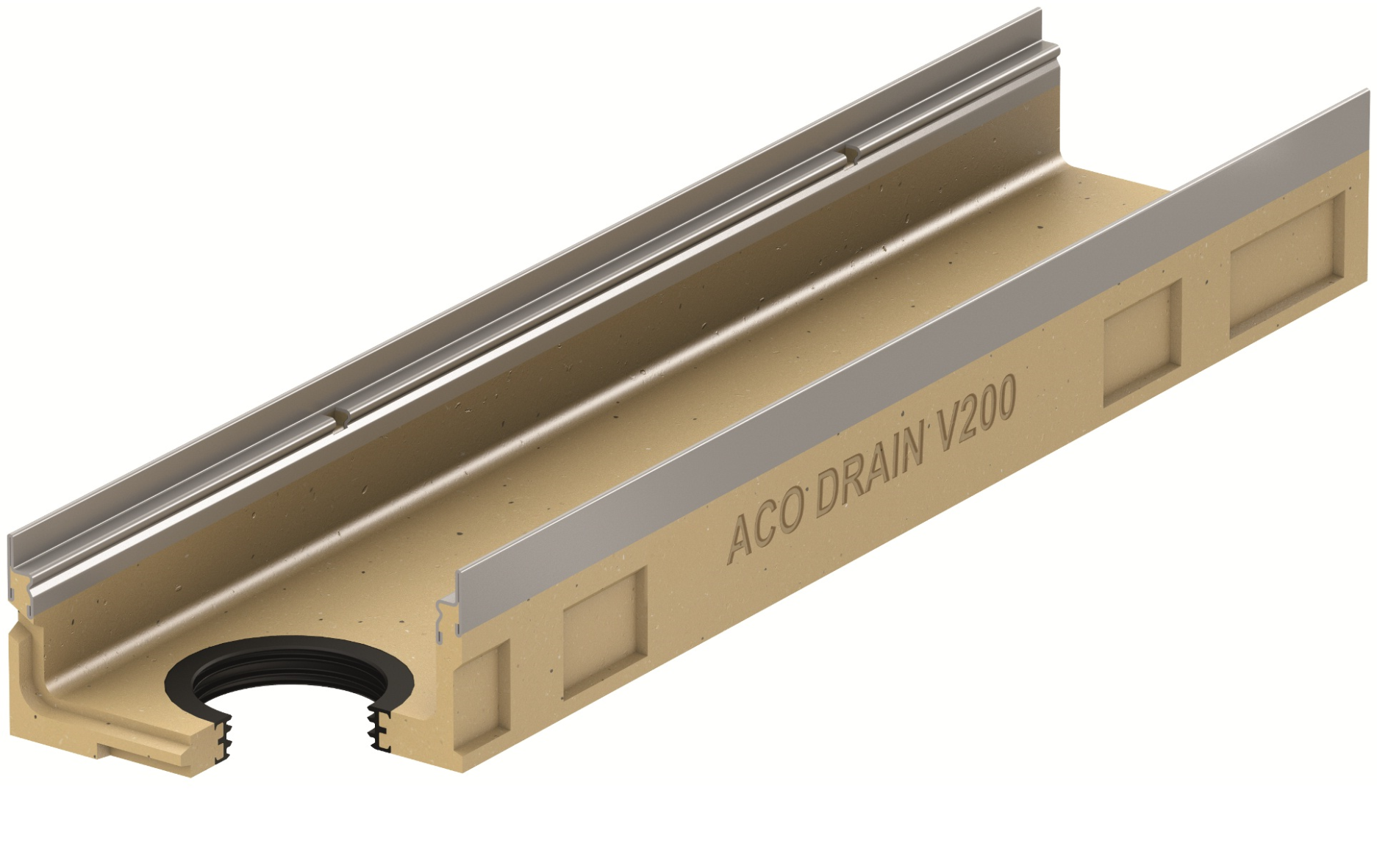 ACO 13122 ACO V200S-12 Lågprofilränna 1,0meter utan fall, integrerad förzinkad stålkant, med bottenutlopp 110, inkl g-ring.