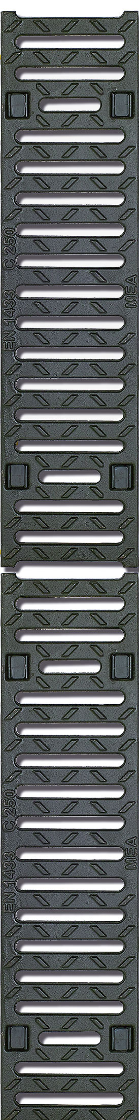 Markränna Mearin Plus 100 av SMC-GRP och kantförstärkt för belastningsklass D400. Rännmoduler för installation utan fall. Invändig bredd 10 cm, utvändig bredd 13 cm.