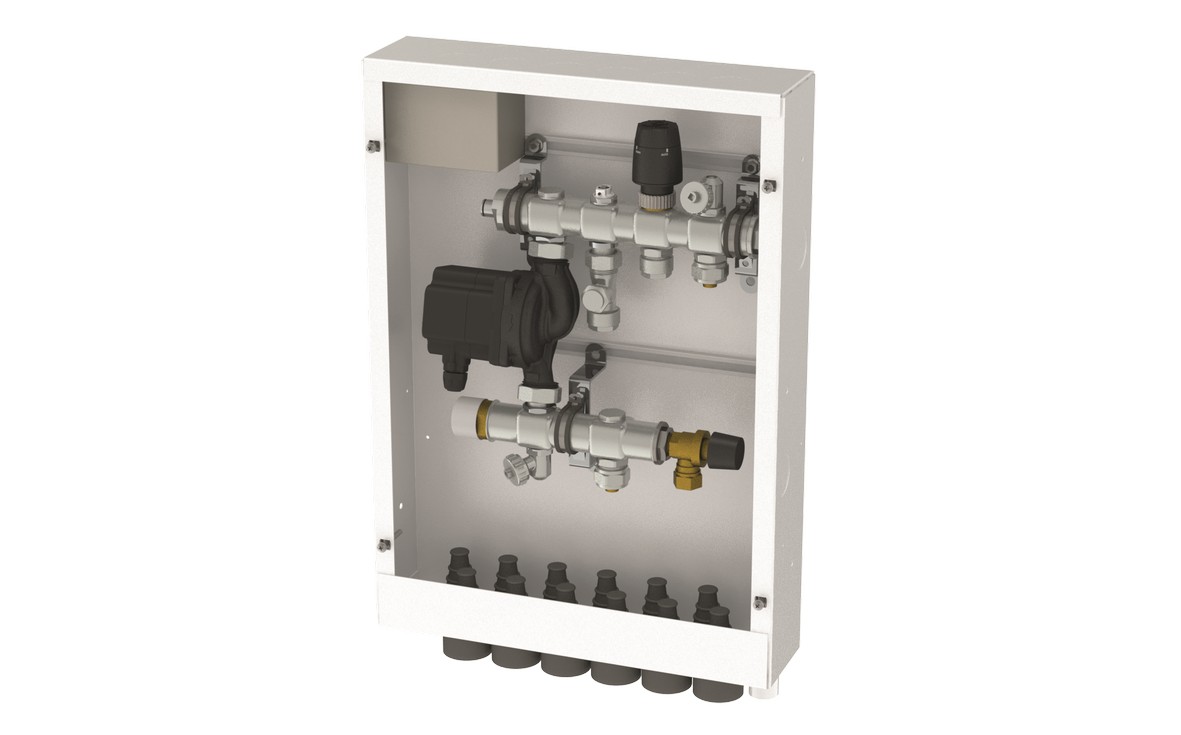 Shunt TMix® XS monterad i skåp med läckageindikering. Klämringskopplingar 17 mm för slingutgångarna och Cu15 mm på primärsidan ingår. Samtliga utgångar ansluts underifrån via skåpets genomföringar. Front med ram beställs separat.