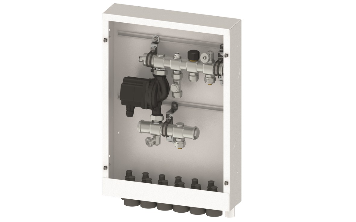 Shunt TMix® XS monterad i skåp med läckageindikering. Klämringskopplingar 17 mm för slingutgångarna och Cu15 mm på primärsidan ingår. Samtliga utgångar ansluts underifrån via skåpets genomföringar. Reglering beställs separat. Front med ram beställs separat.