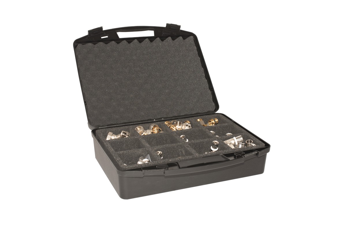 Sortimentväska med 12 fack, fylld med de vanligaste kopplingarna och tillbehören för Thermotechs MultiSystem™ och ThermoSystem™