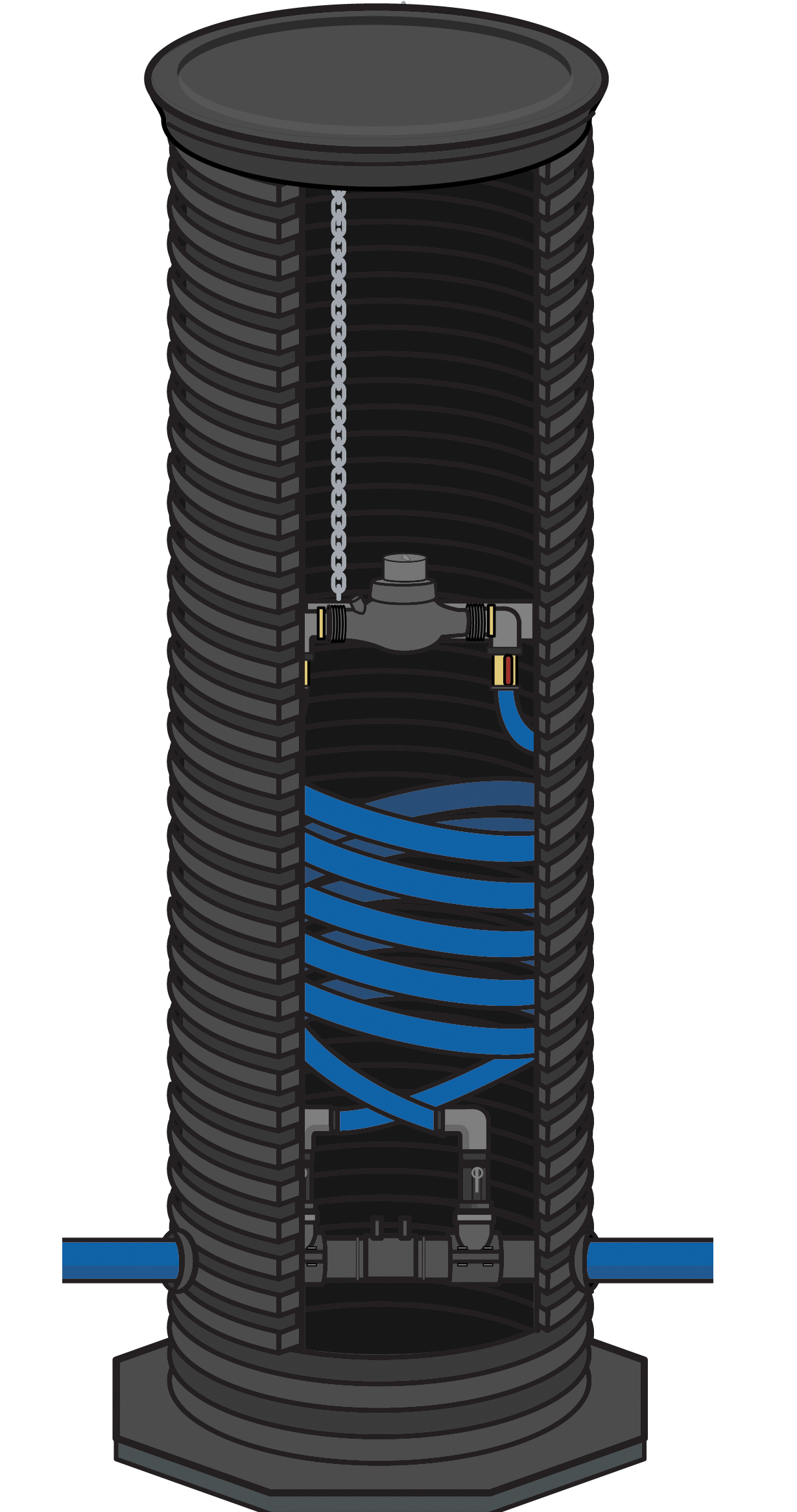 Brimer vattenmätarbrunn V2. Exempel på användningsområden, bostadshus, fritidshus, byggplatser, mm. Försedd med rostfri konsol för QN2,5 mätare (ställbar 190-220mm) med avstängningsventil före och efter mätarkonsolen. Konsol, mätare(mätare ingår ej) och ventiler lyfts enkelt upp tack vare flexibla livsmedelsgodkända slangar och rotationskopplingar. Uppgraderingsbar utan grävning. Tillval Lockisolering, kontrollerbar backventil, tryckreducering, avtappning, återströmningsskydd upp till klass 4 mm. finns som tillval. Varianter QN6 mätarkonsol, konsol med 2x QN2,5. Maxdjup 6m.