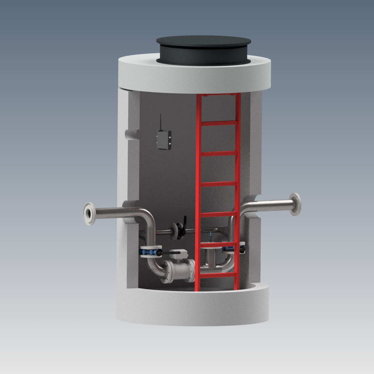 Norvatek Körbar mätarbrunn med DN 100 rörinredning EN 1.4301. DN 1200, justerbar totalhöjd 2730-2810, med lukttät teleskopisk betäckning, A8. Inklusive 1st Aqua Robur Fenix Hub 200, 1st Siemens flödesmätare,1st avstick för tryckgivare, 1st avstick för tempgivare, vridspjällsventiler, bypass ledning, gap stege och rörinrede i EN 1.4301.