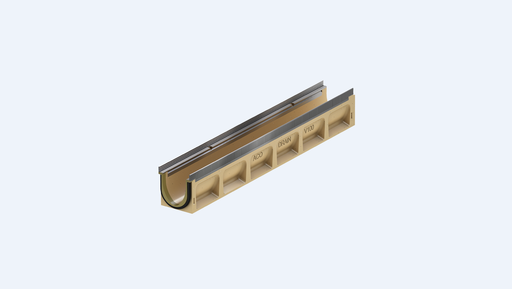 ACO Drain, Multiline Seal in V 100 S Ränna 10, Ränna, 1000 mm med Inbyggt fall 0.5%. Integrerad gummitätning och förzinkad stålkant. Bedömd av Byggvarubedömningen och SundaHus.