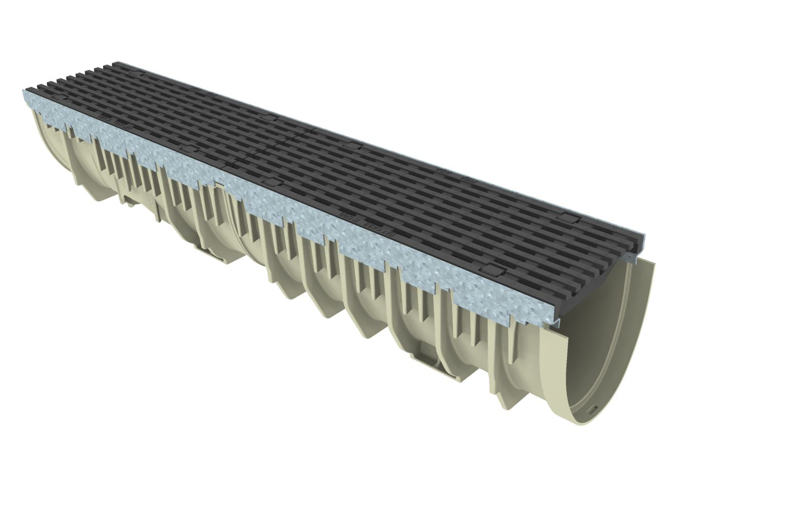 Markränna Mearin Expert 150 av SMC-GRP och kantförstärkning av förzinkat stål. Rännmoduler för installation utan fall. Invändig bredd 15 cm, utvändig bredd 18,2 cm. Belastningsklass A15 tom E600.