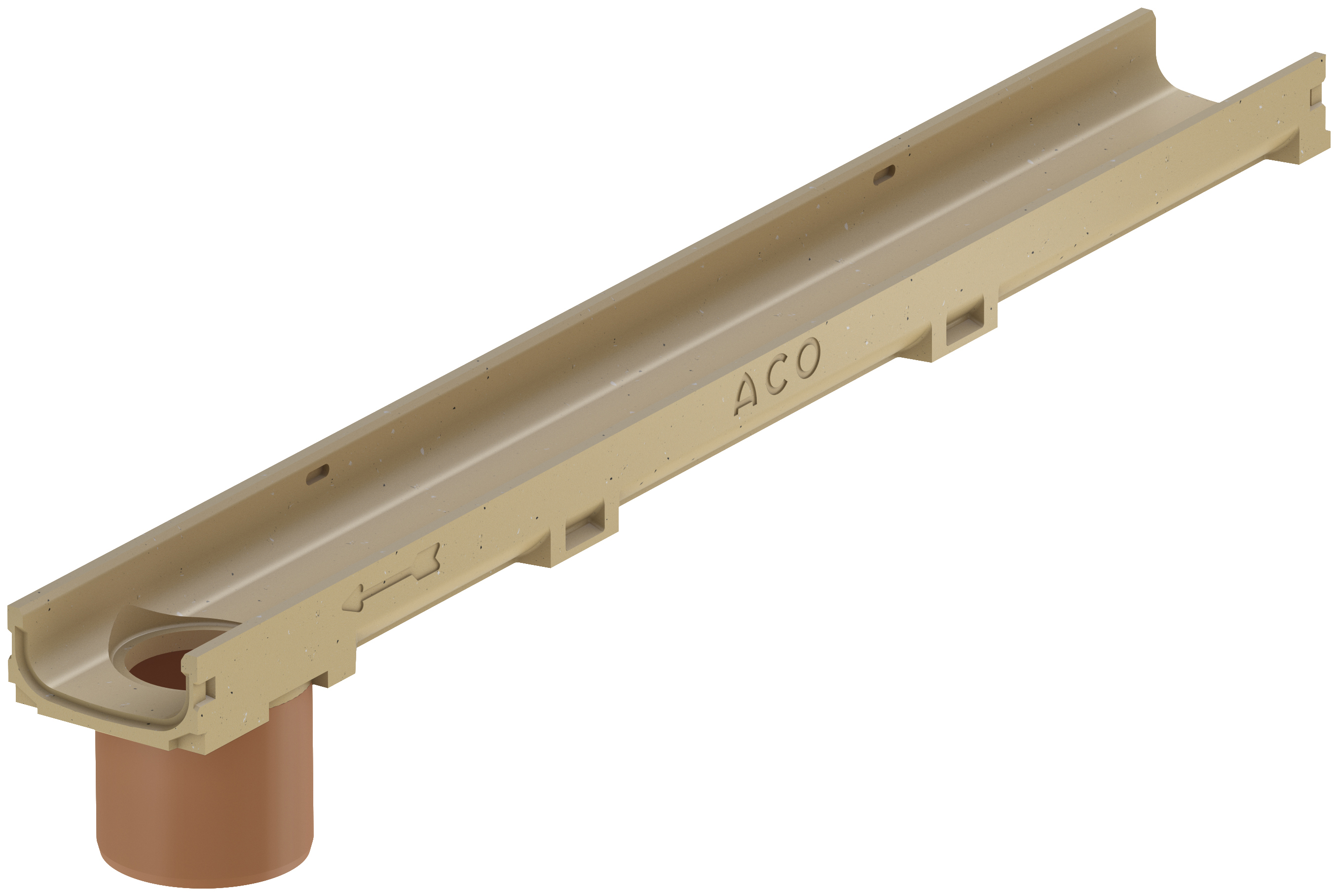 Lågbyggd markränna med bottenutlopp utan galler Ø110. Mått (LxBxH) : 1000 x 118 x 55 mm