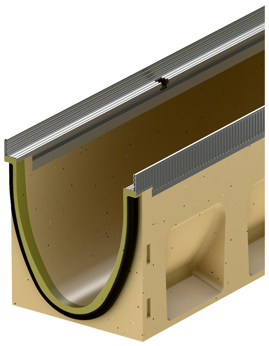 Markränna i polymerbetong utan fall typ 10.0 med integrerad gummitätning och varmförzinkad sargkant. Bedömd utav Byggvarubedömningen och Sundahus.