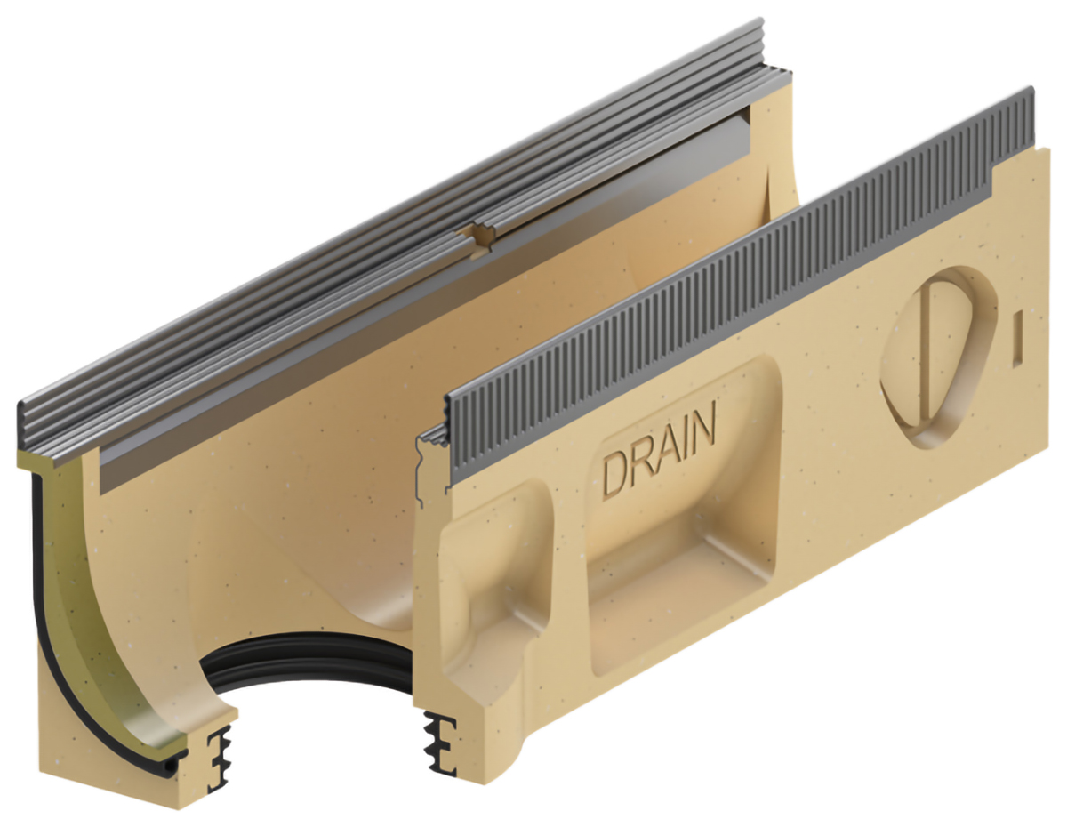 Markränna i polymerbetong utan fall med integrerad gummitätning, Ø200 mm bottenutlopp och förzinkad sargkant. Bedömd utav Byggvarubedömningen och Sundahus.
