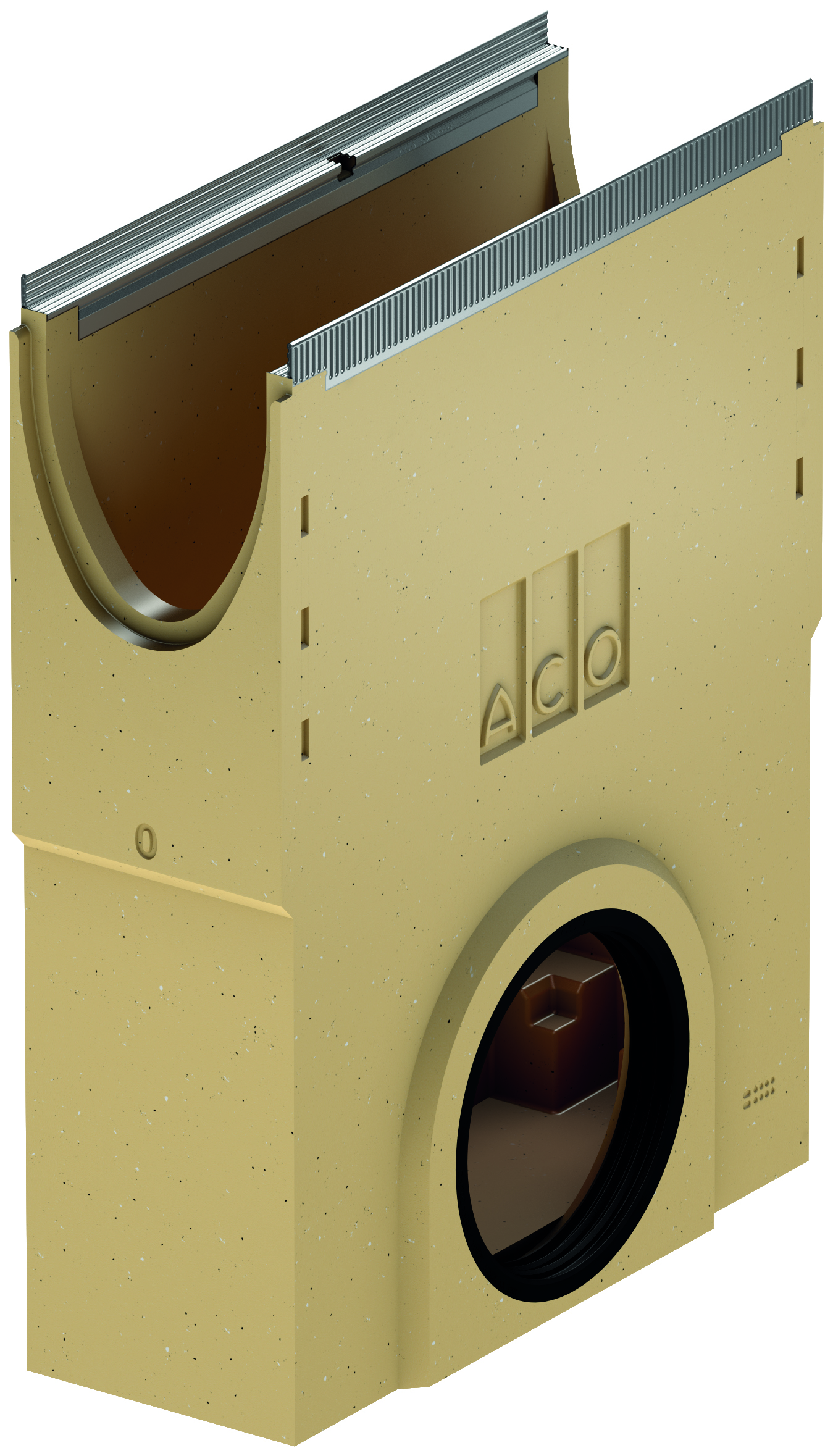 Sandfång 10 i polymerbetong utan fall med integrerad gummitätning. H=710 mm. Ø160/200 mm sidoanslutning och varmförzinkad sargkant. Bedömd utav Byggvarubedömningen och Sundahus.