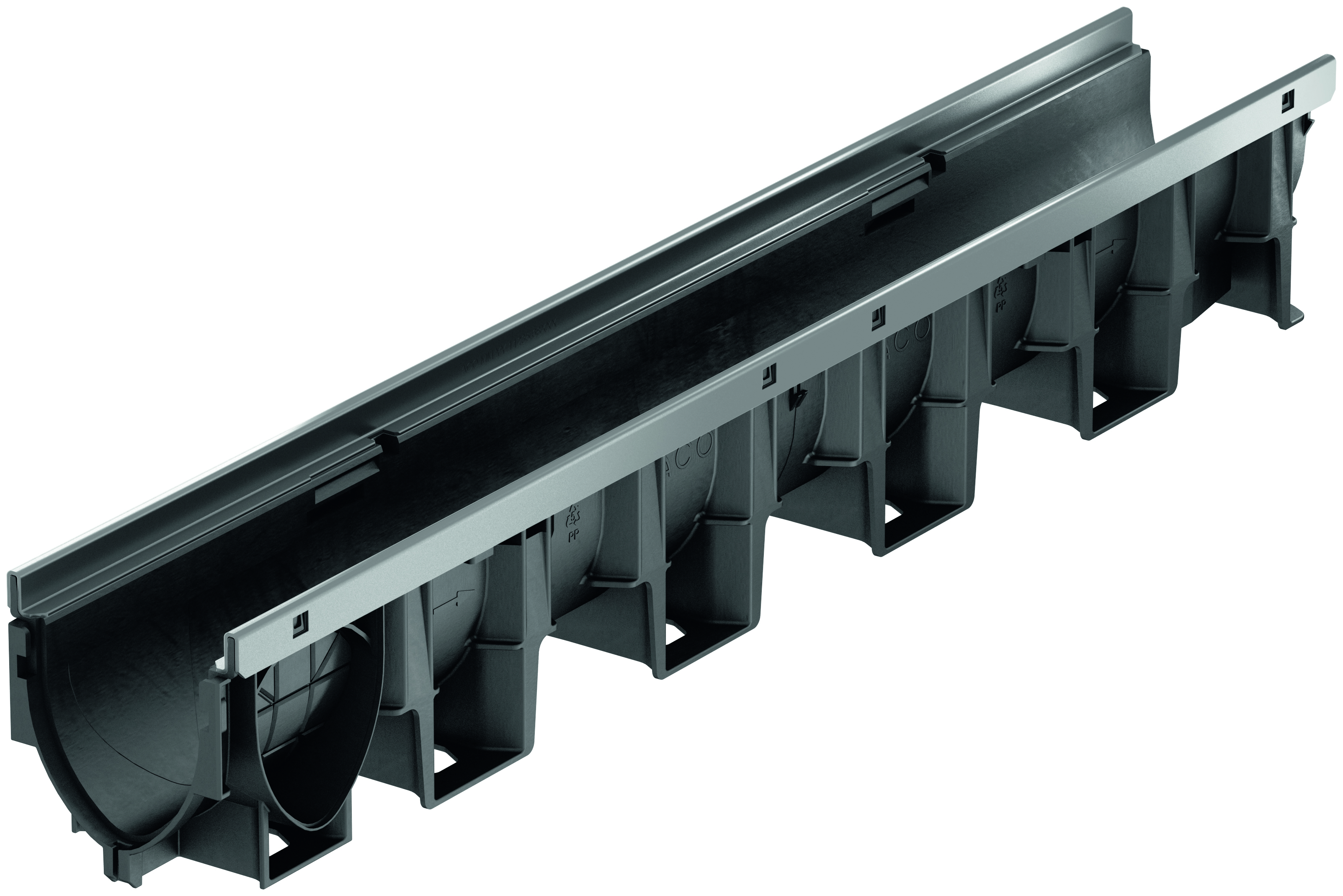 Markränna i polypropen med varmförzinkad sargkant. Utan fall. V-tvärsnitt. "Knock-out" för anslutningar