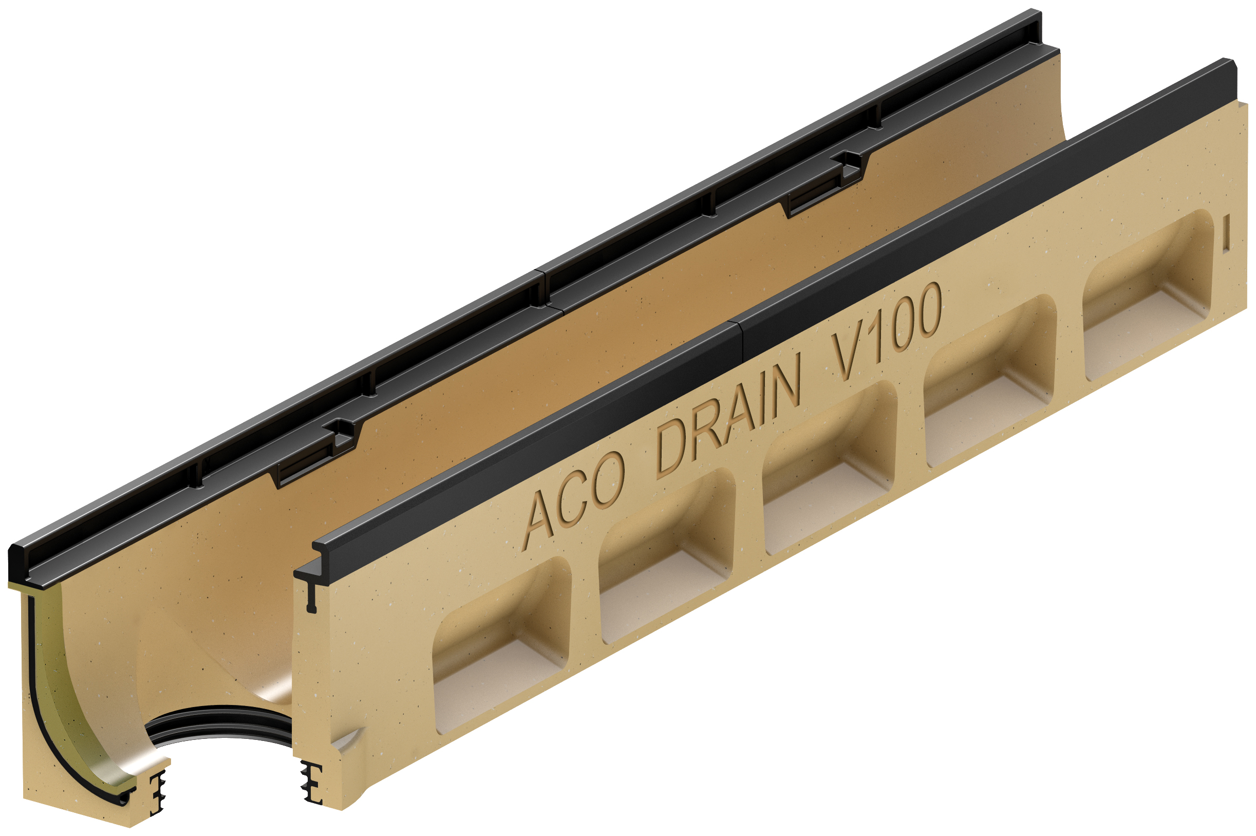Ränna utan fall. Typ 5.0.2 med bottenutlopp DN100. Integrerad gummitätning. Tillverkad i polymerbetong med förstärkt sargkant i segjärn. Integrerad bullerdämpning. Belastningsklass upp till F900.