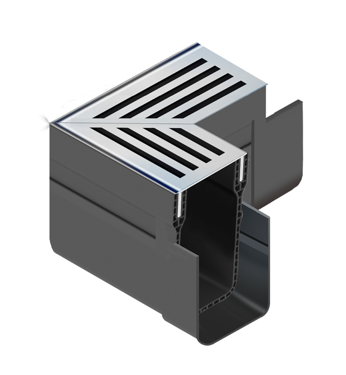 Med hjälp av ACO Slimline Hörnelement kan efterföljande rännsektion monteras 90°. Galler i svart pulverlackad aluminium.