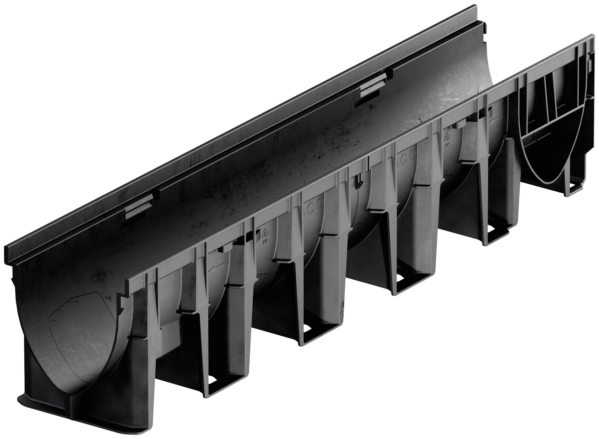 Markränna i polypropen med sargkant polypropen. Utan fall. V-tvärsnitt. "Knock-out" för anslutningar
