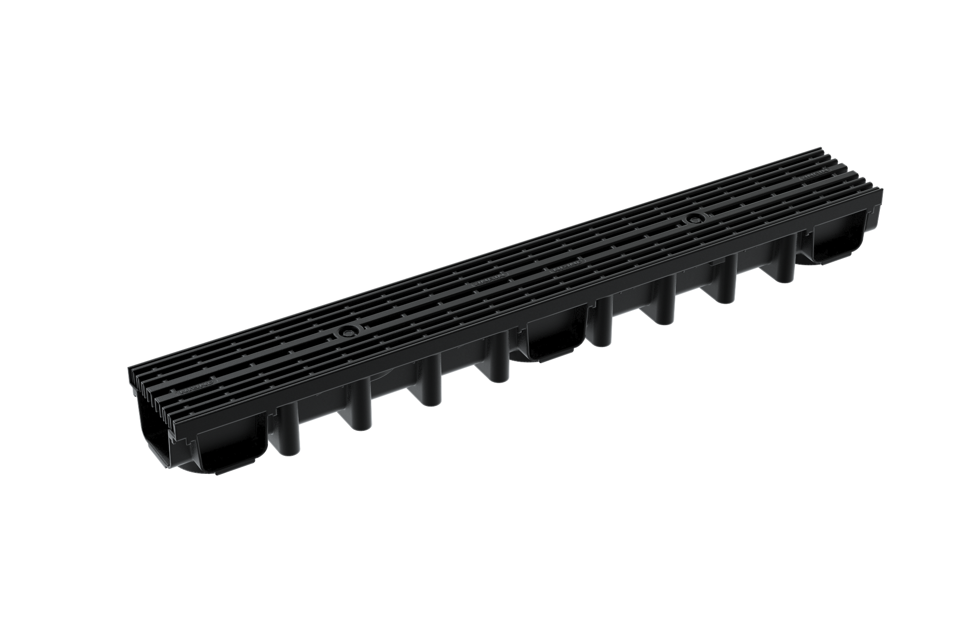 Linjeavvattning i polypropylen för att ta hand om nederbörd. Rännorna är anpassade för parkering, parkeringsgarage, gång- och cykeltrafik, vägar, flygplatser samt tung industri.