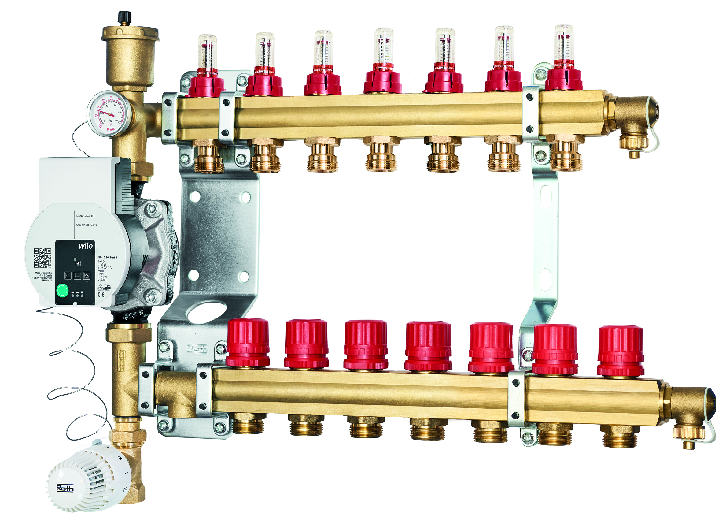 Roth ShuntUnit-7 Komplett enhet med pump och fördelare med flödesmätare.Med termisk framledningsbegränsning.Kapacitet: Upp till 100 m².Max. yta per slinga beror på val av rördimension och förläggningssätt.