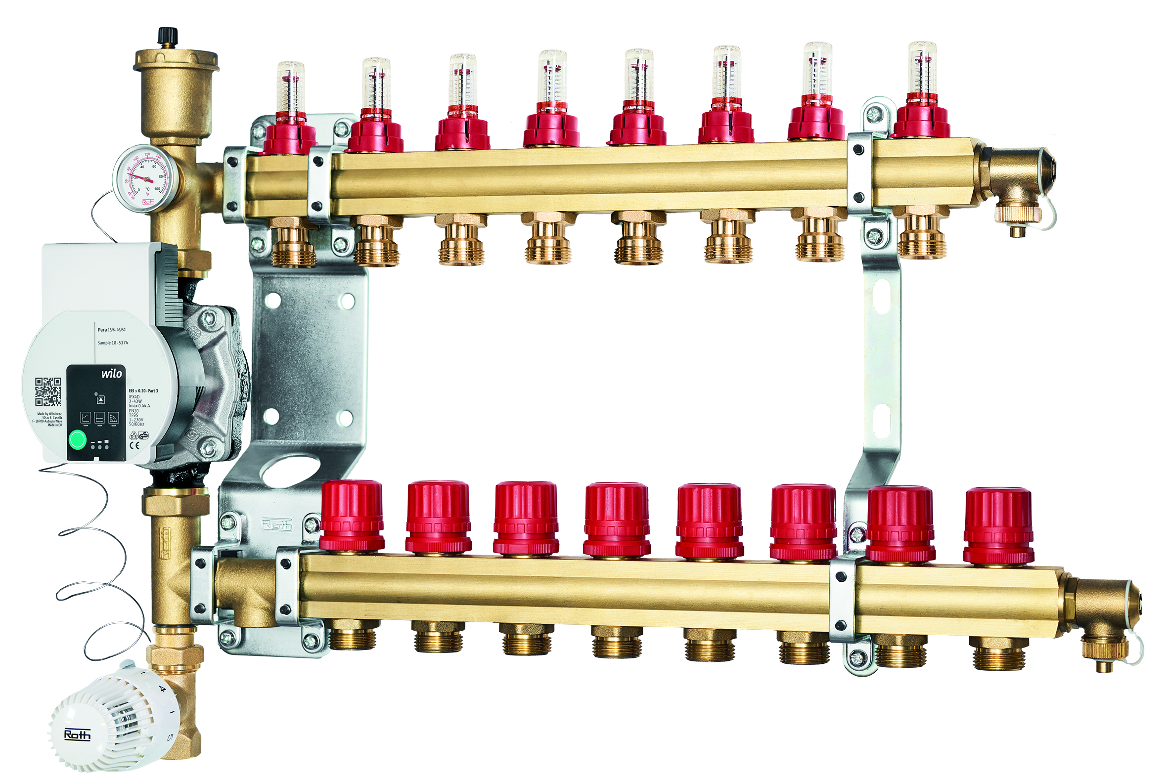 Roth ShuntUnit-8 Komplett enhet med pump och fördelare med flödesmätare.Med termisk framledningsbegränsning.Kapacitet: Upp till 100 m².Max. yta per slinga beror på val av rördimension och förläggningssätt.